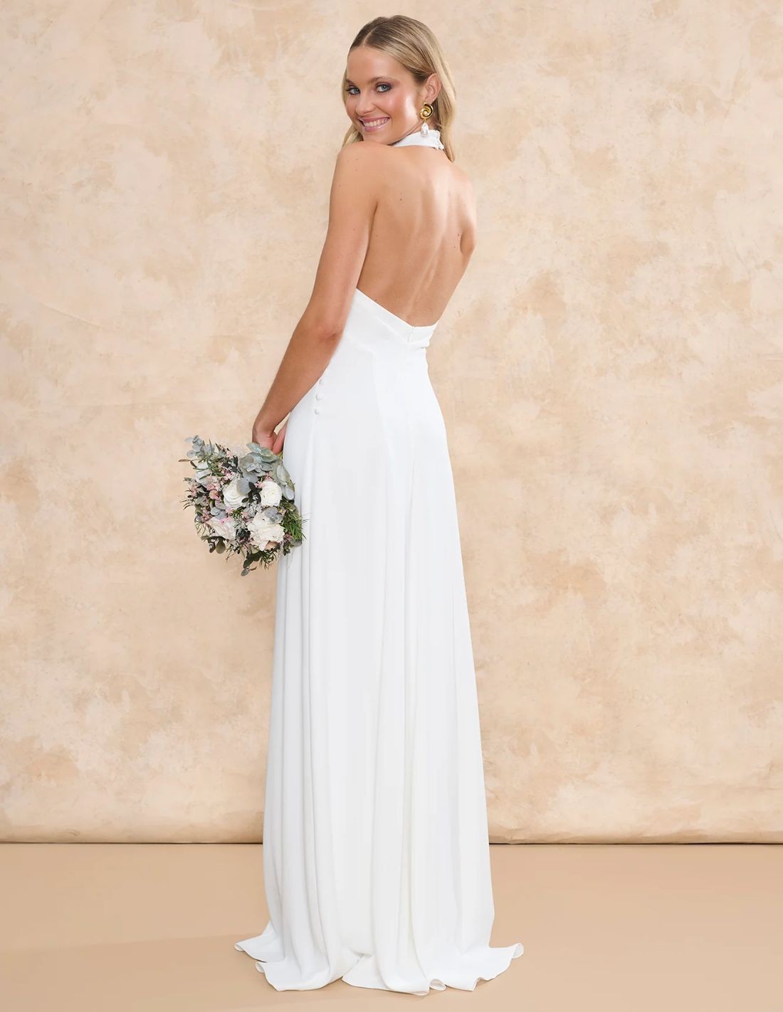 This long wedding dress with draped halter neckline is an elegant and sophisticated proposal for brides looking for a timeless style. The halter neckline with delicate draping brings fluidity and enhances the bust with a soft and feminine finish, creating a slender and harmonious silhouette. The open back adds a sensual and refined touch, perfectly balancing the simplicity of the front design. The long flowing skirt accompanies the movement with lightness, providing comfort and an ethereal air ideal for civil weddings, outdoor celebrations or intimate ceremonies.