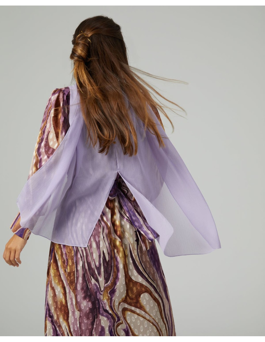 This guest cape is made of exquisite lilac cationic chiffon, a fabric known for its soft and flowing drape, offering a fine texture that is pleasant to the touch. This material has the ability to change hue depending on the light, providing a dynamic and attractive visual effect, giving life and movement to your perfect guest ensemble.
