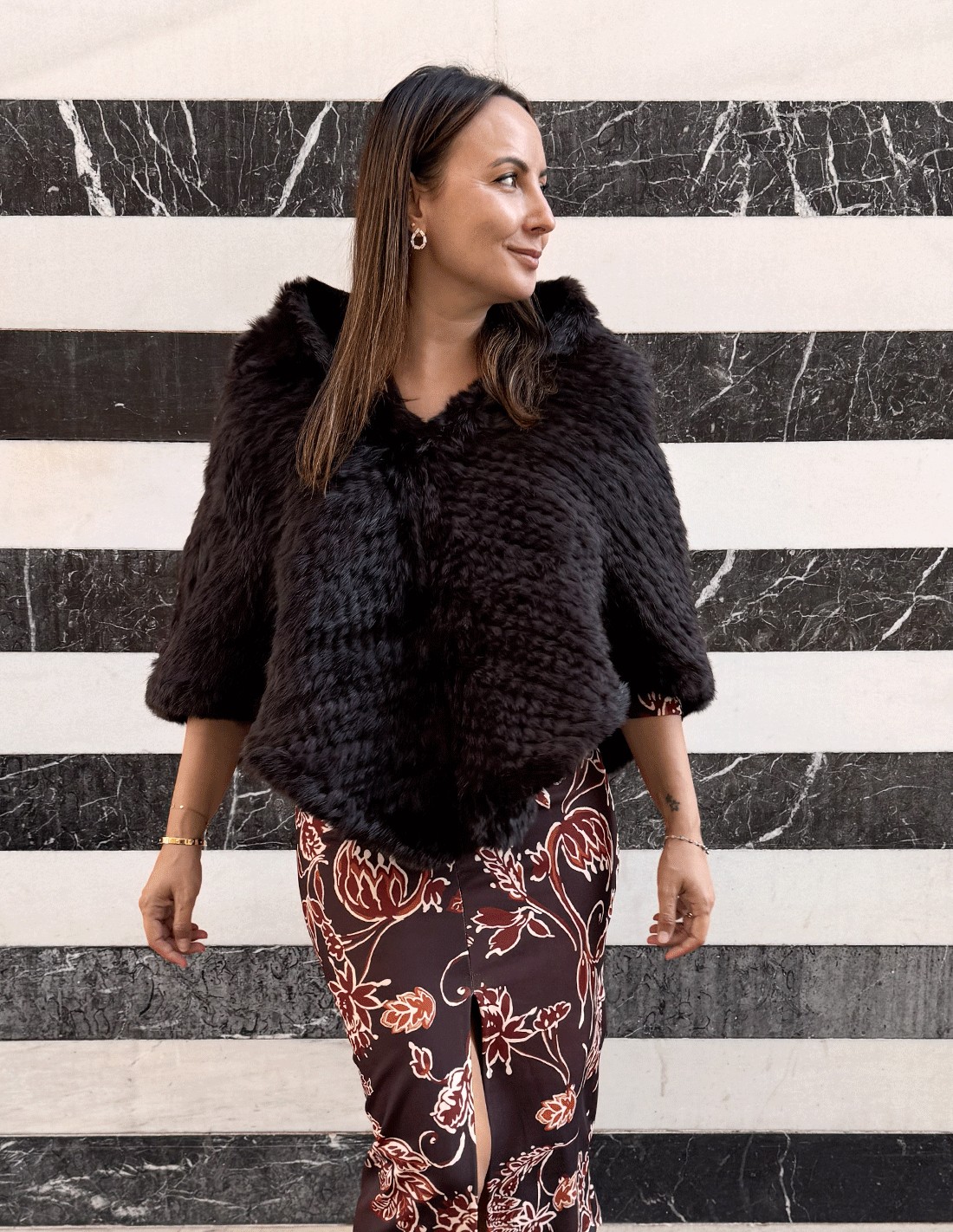 This braided rabbit cape is made from 100% natural fur, carefully handcrafted to achieve a unique braided finish that adds relief, movement and elegance.