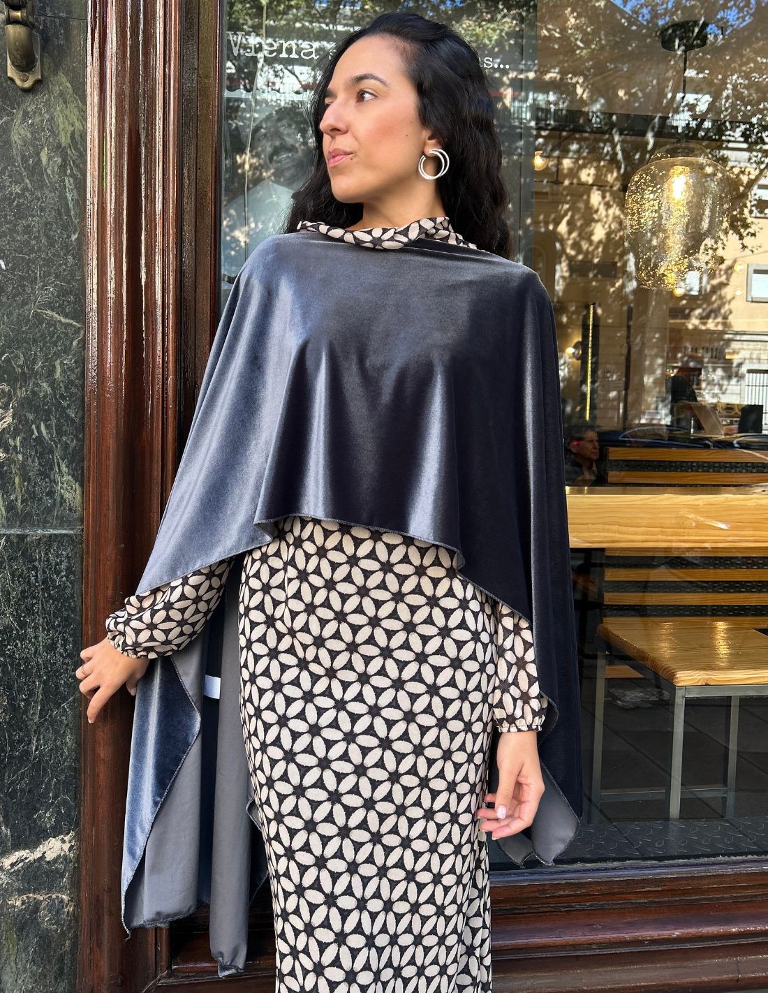 If you are looking for an infallible accessory for this season, this short guest cape made of velvet fabric, will be your ally! A cape in gray color super versatile and totally on trend. Perfect to elevate your look with style and elegance as well as to keep you warm and make it the star accessory for fall/winter events. We love to combine it with two-piece outfits, both plain and printed or dresses. In addition, you can wear it both in more formal occasions and in everyday looks.