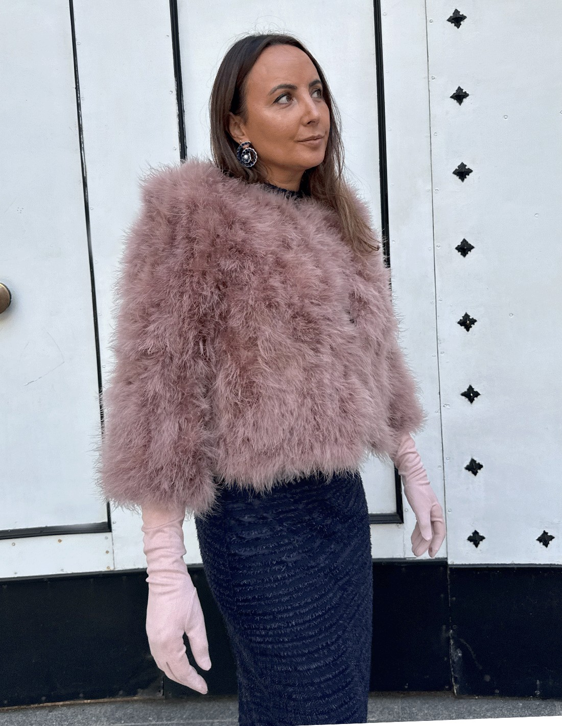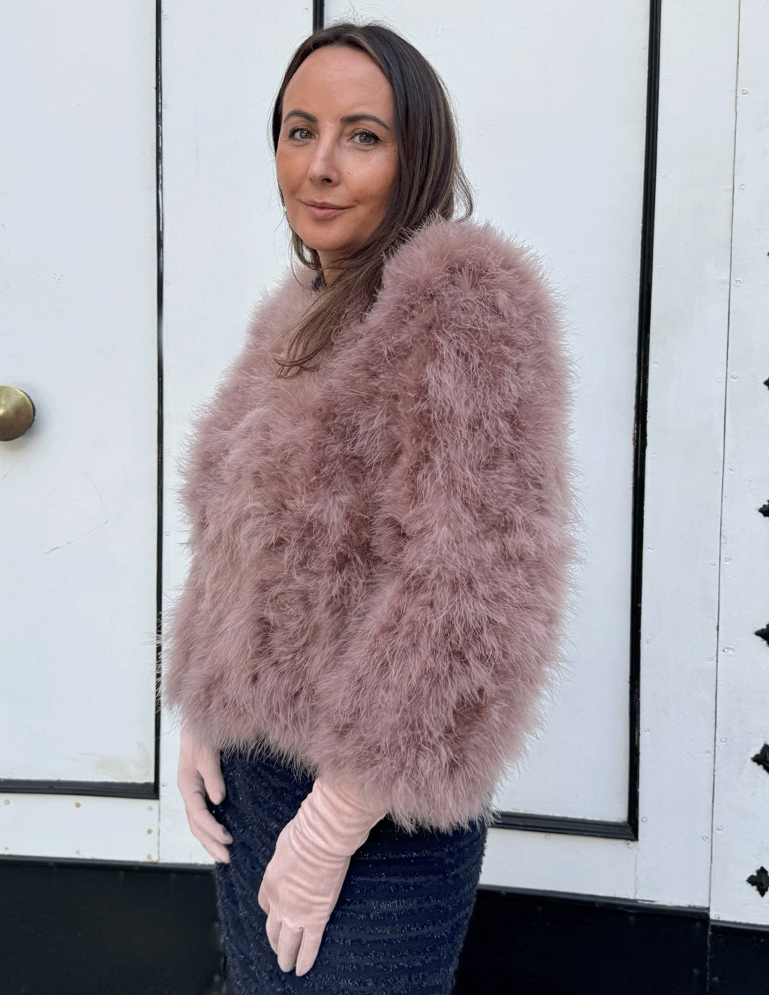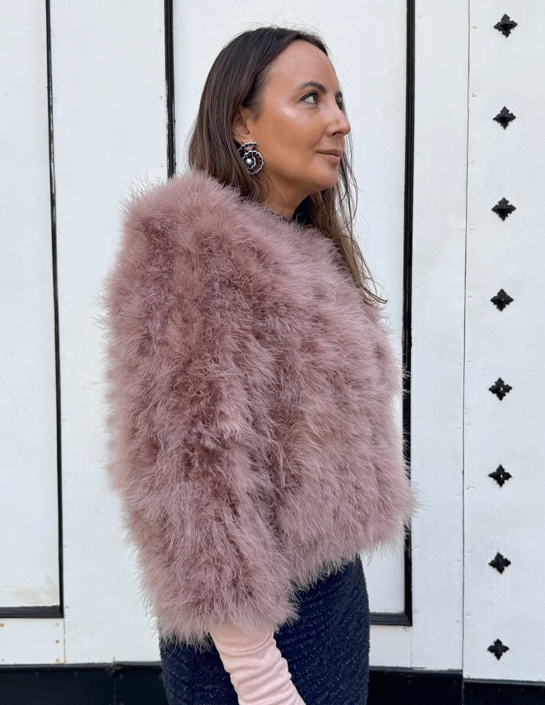Ostrich feather jacket in make-up pink for wedding and event GUESTS