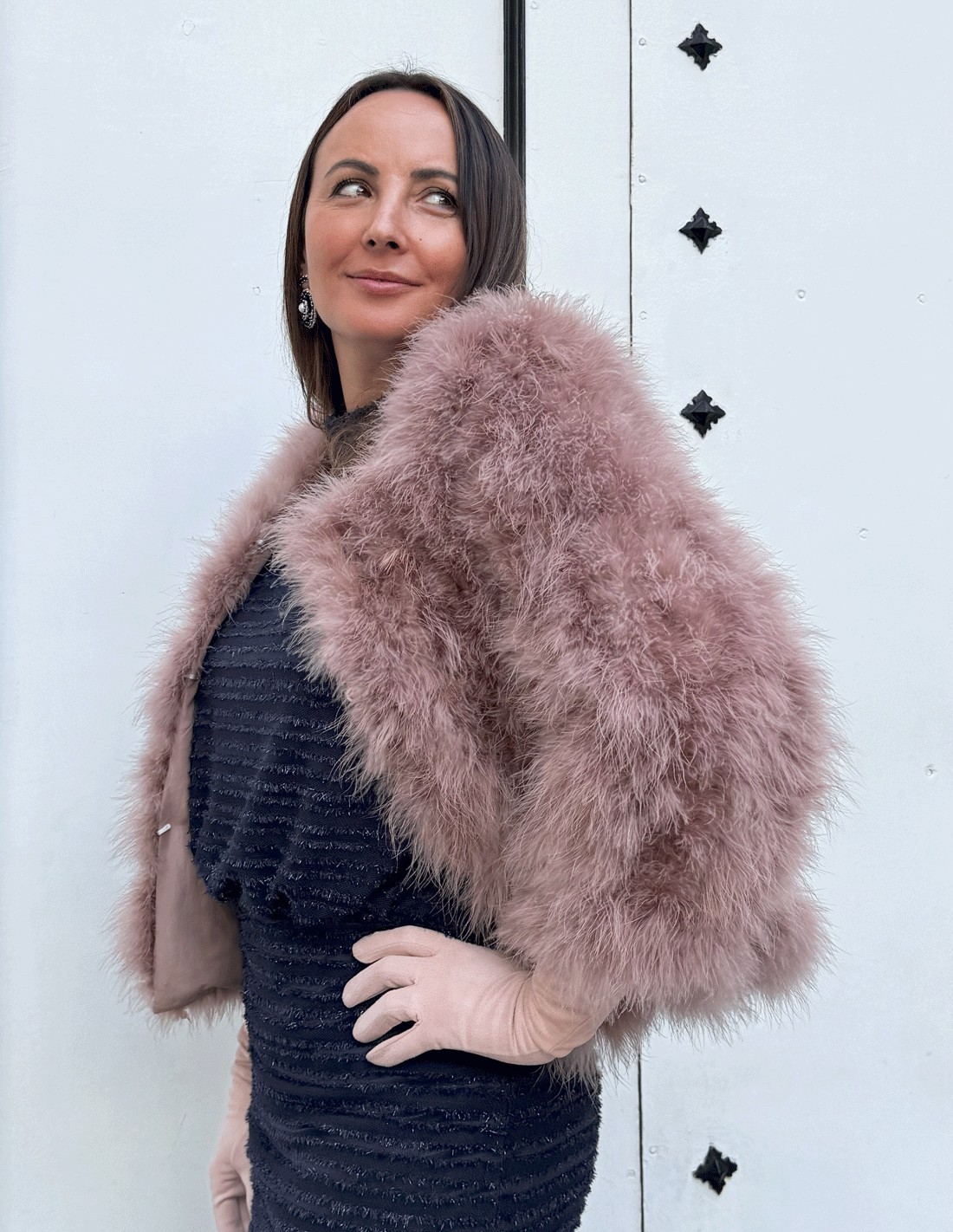 The natural ostrich feather jacket in makeup pink for fall and winter weddings and events is the definition of timeless elegance. Made with 110% natural ostrich feather, dyed in a delicate shade of makeup pink, it brings a sophisticated, romantic and very feminine air to any party look.