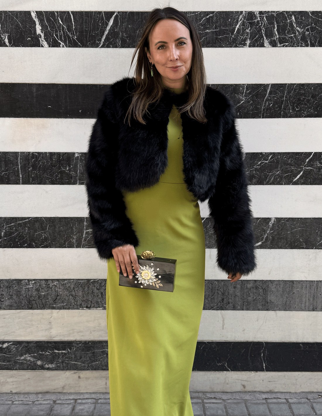 Premium black faux fur jacket. Soft, elegant and comfortable, with hook-and-eye closure and inner lining. Perfect for guests and events, or to elevate casual looks.