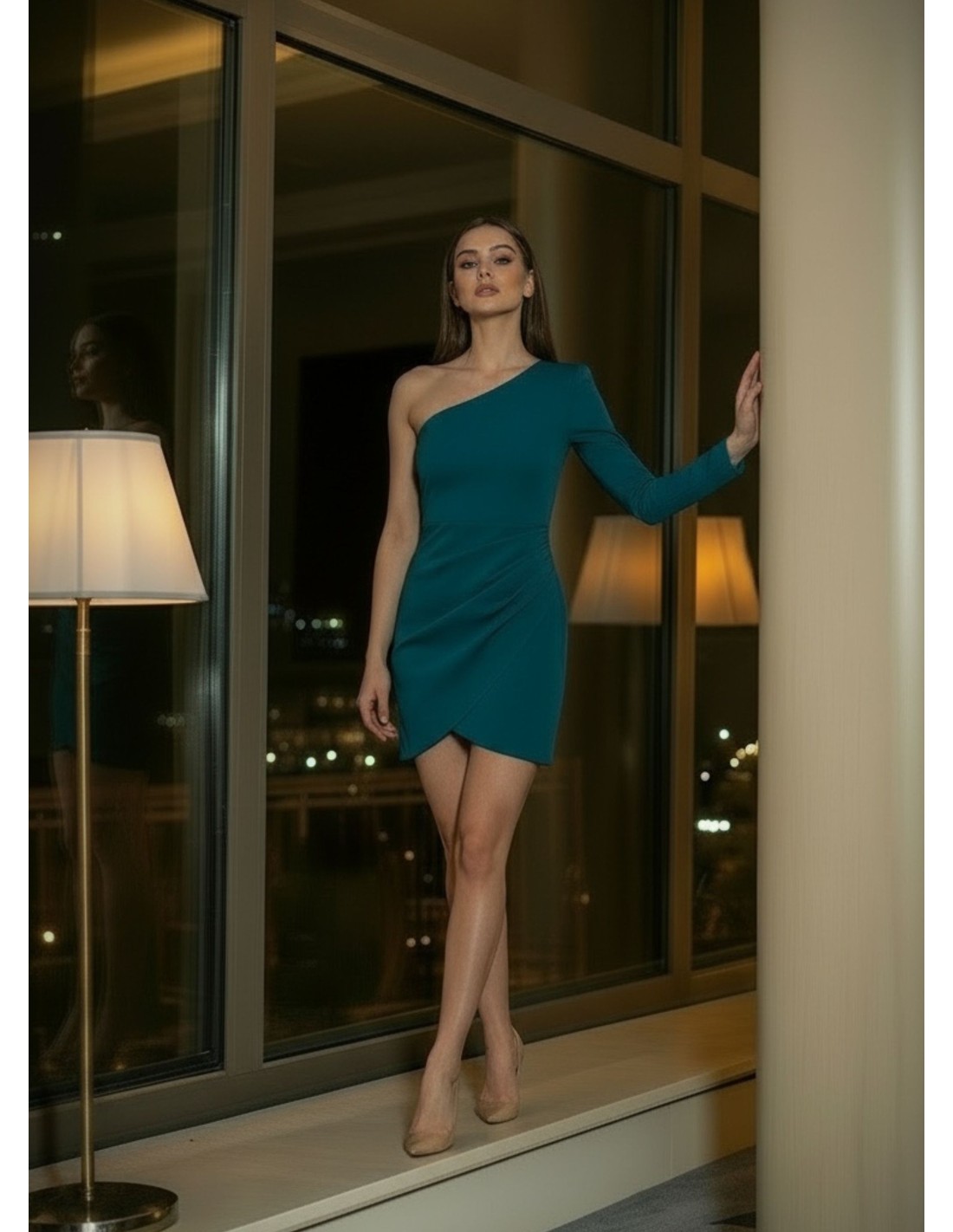 This short green dress stands out for its modern and sophisticated design, ideal for those looking for a garment that combines style, elegance and a contemporary touch. Its asymmetrical neckline provides an original and striking silhouette, creating a perfect balance between sensuality and distinction. The presence of a single long sleeve adds dynamism to the design.