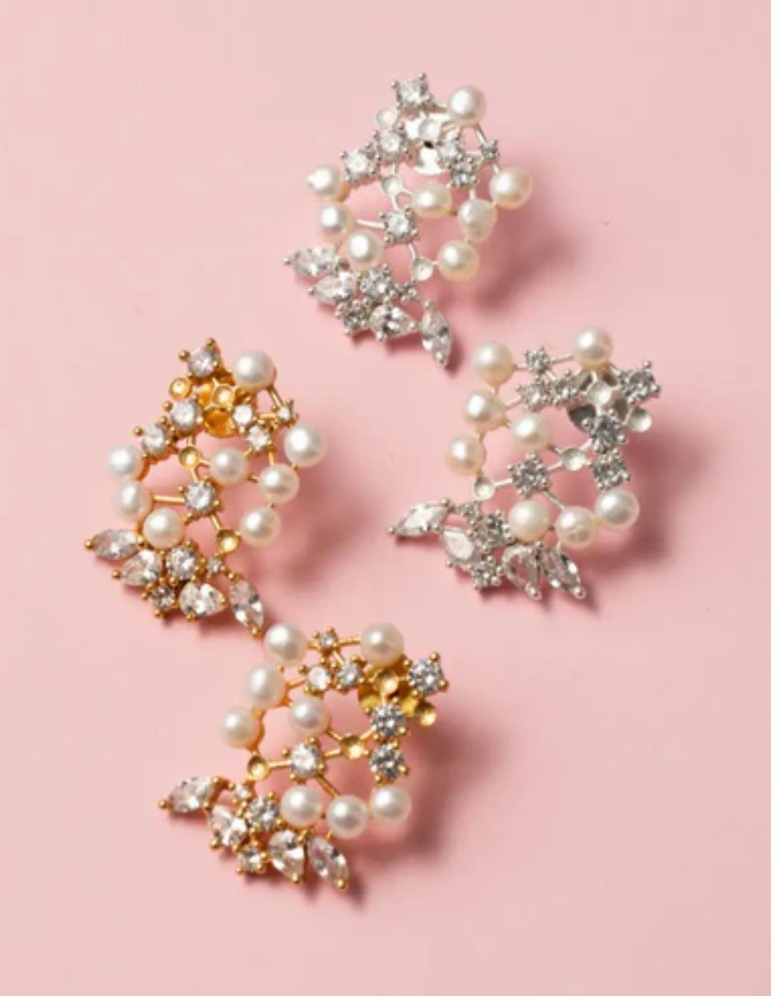 These earrings are ideal for brides and guests who want to complete their look with a sophisticated accessory. With a design formed by small pearls with zirconia sparkle set in the shape of a flower, with an asymmetrical design, bringing a touch of light and elegance to the face. Perfect for special events such as weddings and christenings.