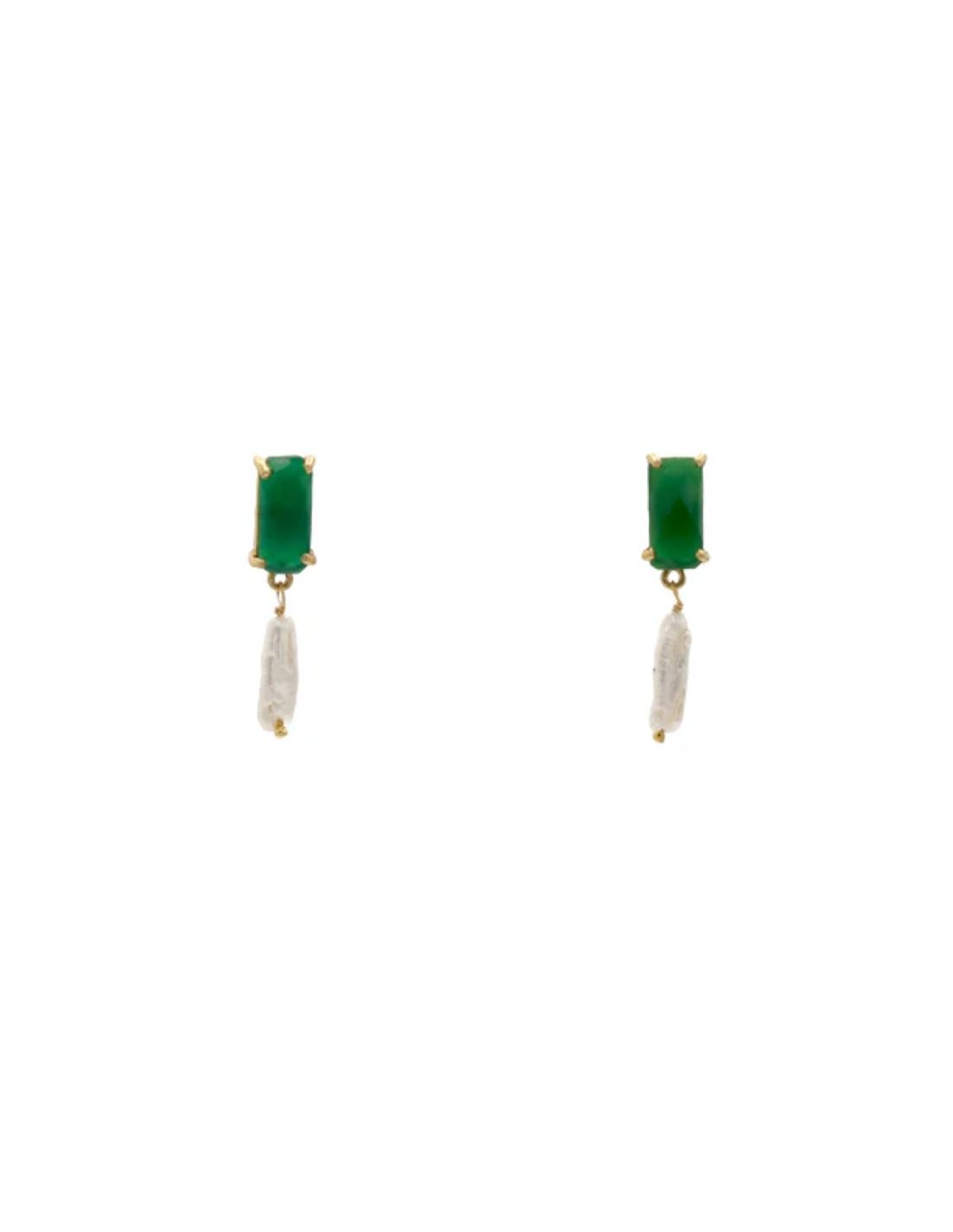 Earrings with a subtle and simple design that combine a faceted green stone with a suspended baroque pearl, creating a balanced and elegant design to bring light to the face. Ideal for those guests who are looking for a complement that elevates their look to the highest level but in a simple and sophisticated way, perfect for special events such as weddings and christenings.