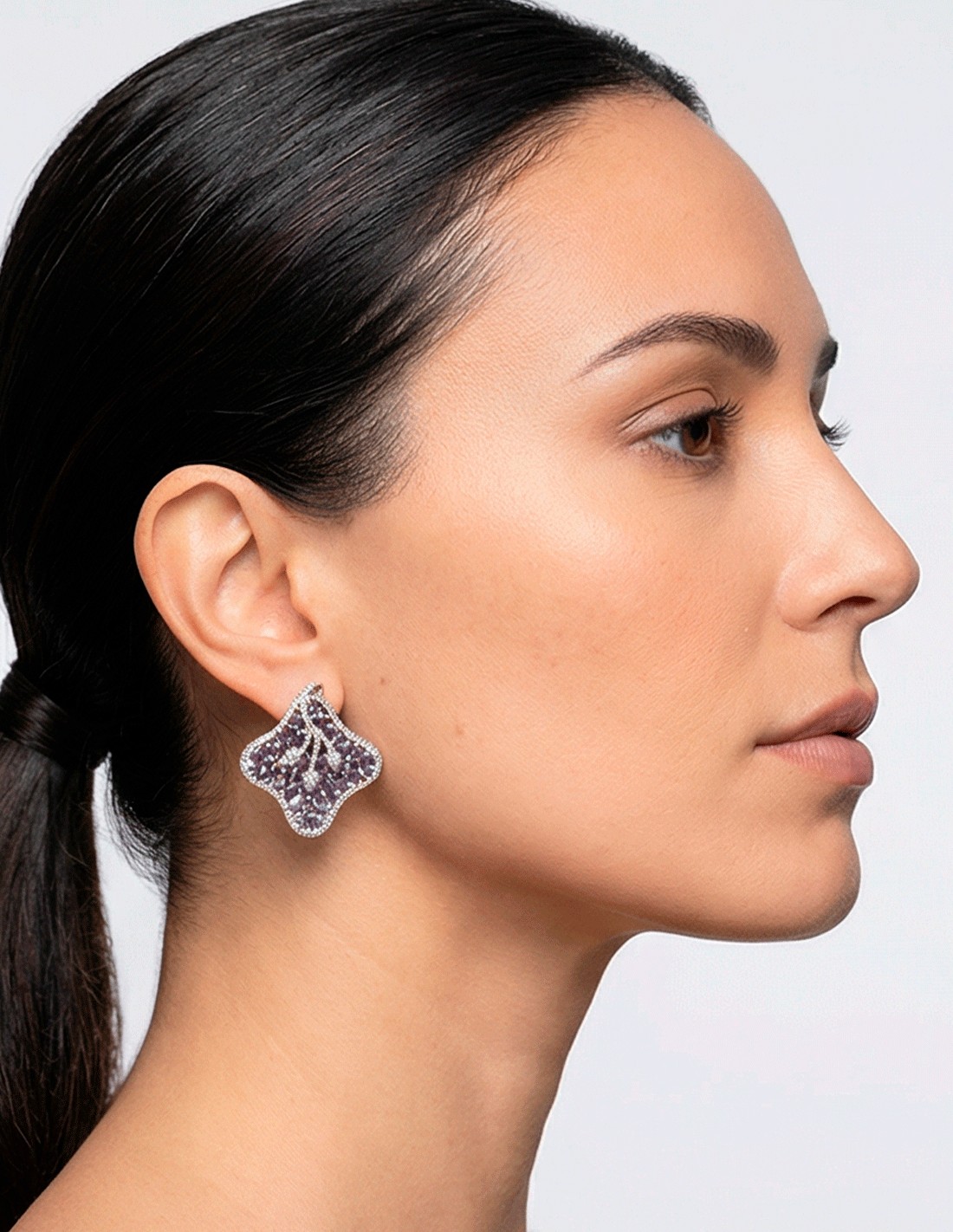 The soft and sophisticated lilac shade lends a romantic and elegant air, illuminating the face and softening the features. The semi-precious stones reflect the light in a subtle way, creating a delicate shine that enhances any style without being excessive.