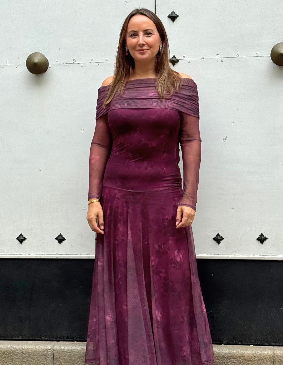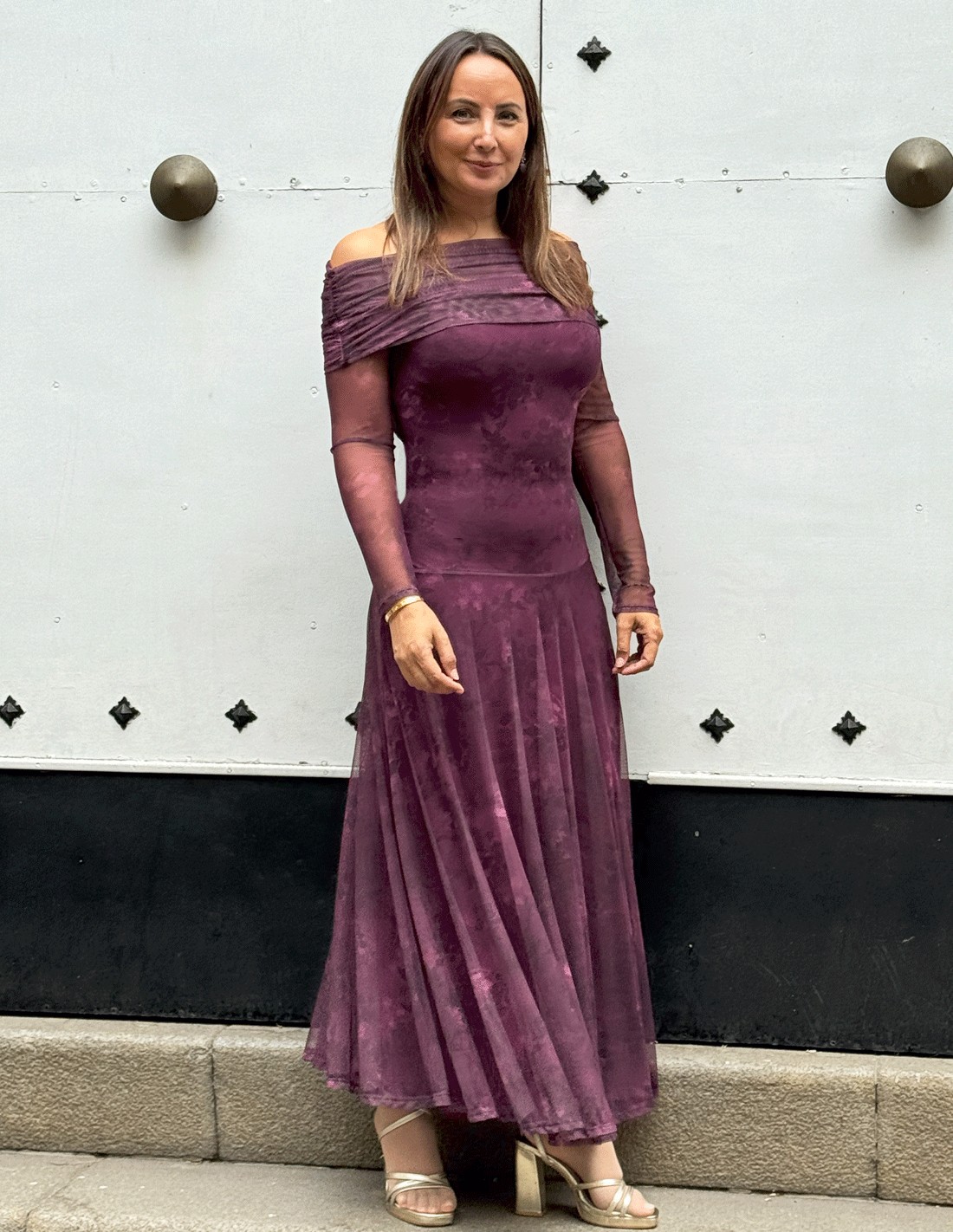 If you are looking for a versatile dress that you can wear both for a special event and for a dinner, this long dress may be your ideal choice. A dress designed with long cut in printed tulle fabric, in mauve tones with flowers, with bardot neckline that brings that touch of style to the garment. Perfect for autumn and winter occasions, combined with a stole.