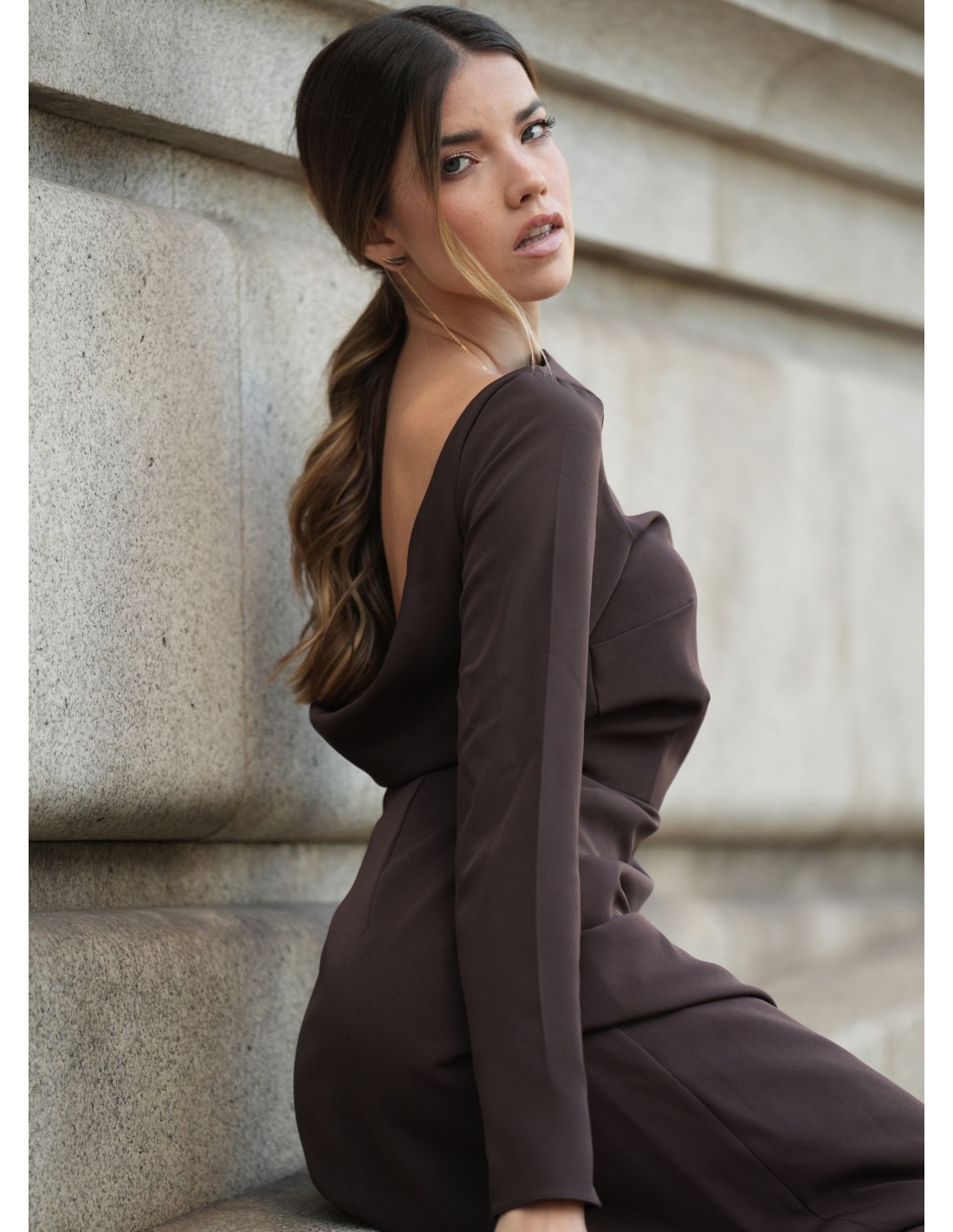 This long brown dress is the perfect choice for those looking for elegance, sophistication and comfort in a single garment. Its boat neckline adds a classic and refined touch, while the long sleeves make it an ideal choice for seasonal events. The back incorporates a delicate plunging neckline that adds a striking, feminine detail, balancing the design with a touch of understated sensuality.