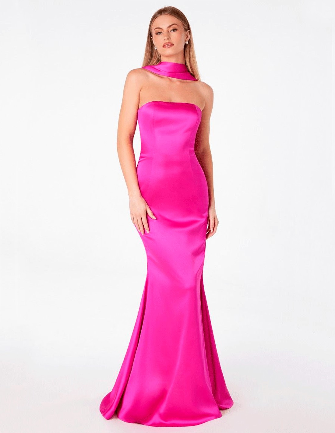 The ensemble is completed with a matching shawl, ideal for adding versatility to the style and adapting it to different moments of the event, from the ceremony to the evening celebration. A design designed to stand out for its elegant simplicity and clean lines, perfect for weddings, galas and special events.