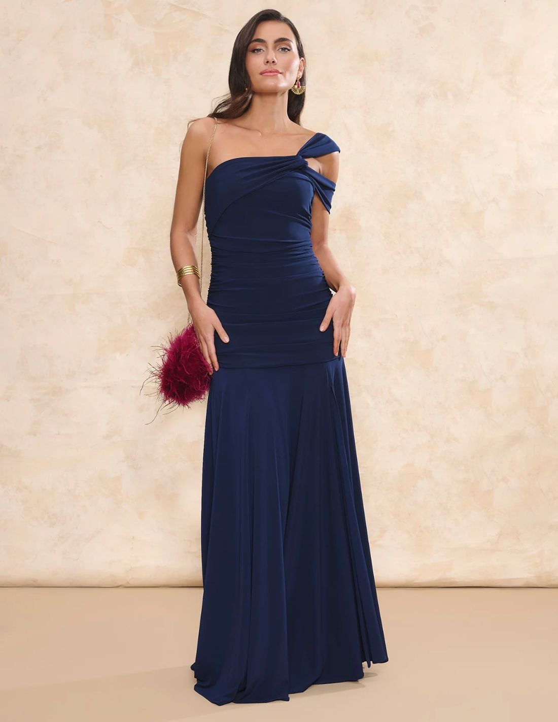 Long guest dress in navy blue, designed to bring elegance and sophistication to special occasions. Its asymmetrical neckline enhances the shoulders and neckline with a modern and flattering finish, while the delicate fit on the body slims the silhouette. The design is completed with a long layered cut that adds movement and an ethereal air to the walk, creating a fluid and refined effect. Crafted in a soft and adaptable fabric, it is ideal for weddings, evening events or formal celebrations where you are looking for an elegant, feminine look with personality.