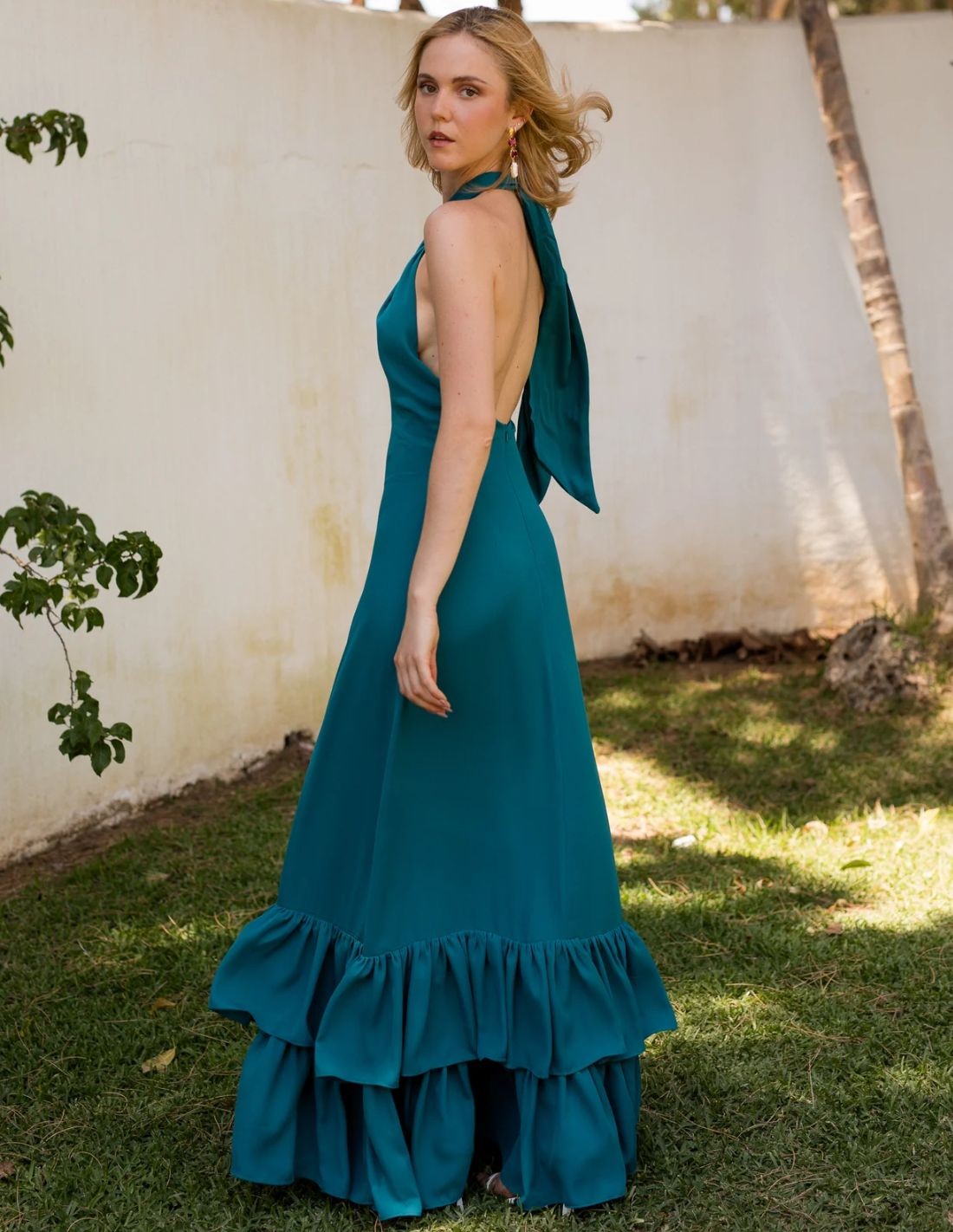 If you have an afternoon wedding, a graduation or an evening event, this long guest dress made of georgette in petrol green, with an elegant and structured design with open back, will be a sure hit. A cross over halter neckline design, ideal to highlight the shoulders and give a slender appearance to the torso. It also has a pair of ruffles that finish the dress, giving fall and originality to the garment