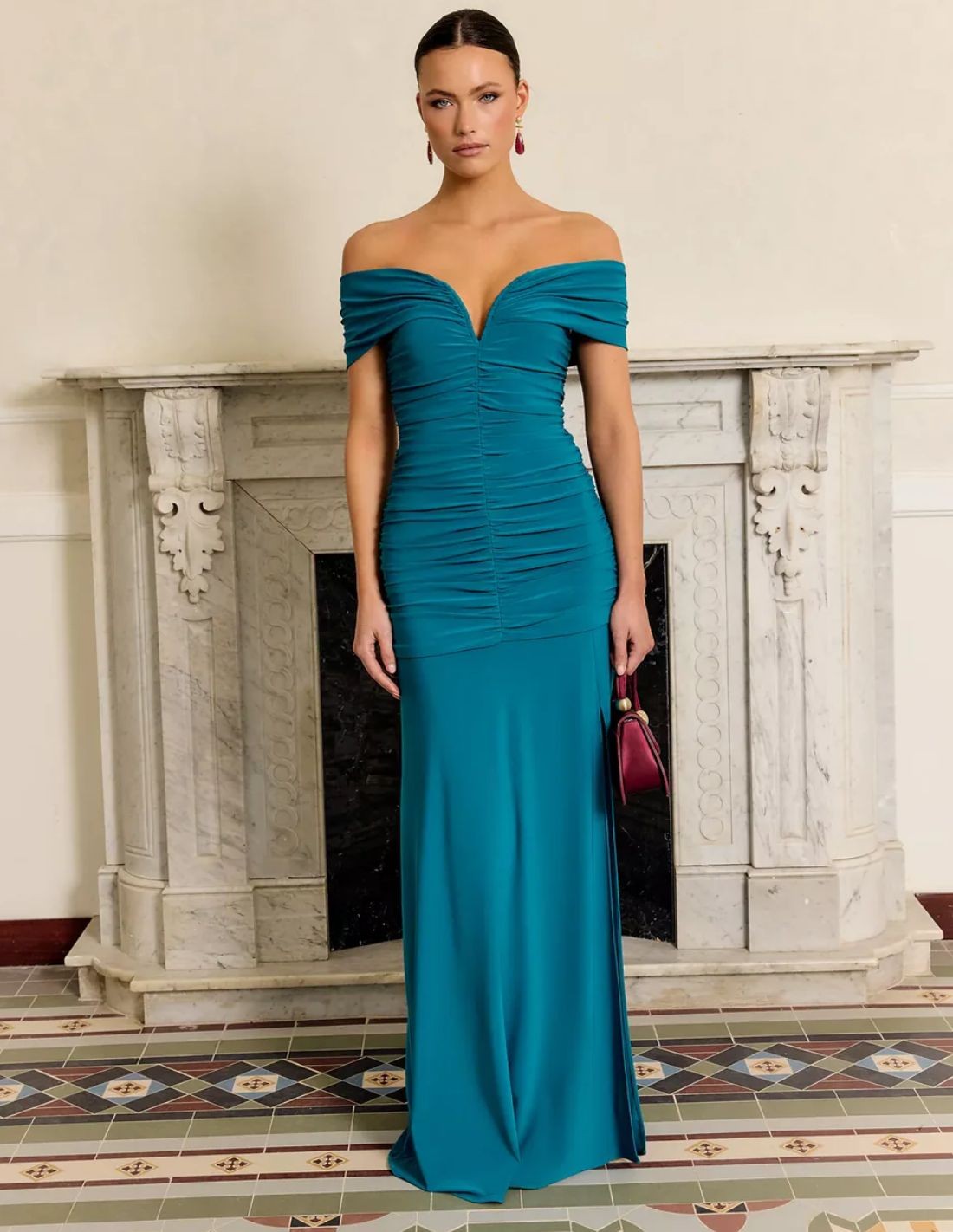 Long eveningdress in turquoise with an elegant mermaid silhouette that enhances the figure and provides a sophisticated and feminine finish. The off-shoulder design with an off-shoulder neckline delicately frames the neck and shoulders, while the gathered bodice slims the waist and highlights the silhouette with a flattering fit. The softly flowing skirt incorporates a side slit that adds movement, sensuality and comfort as you walk, creating the perfect balance between glamour and sophistication. Ideal for weddings, graduations, galas, evening parties and special events where you want to stand out with a stunning and refined look.