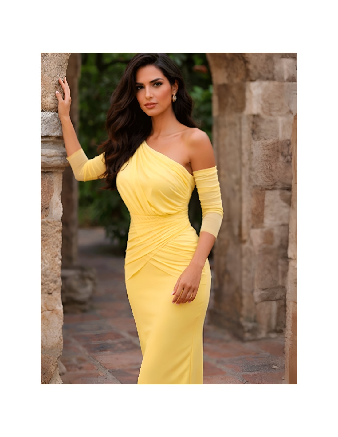 This midi guest dress in pastel yellow, designed to enhance the silhouette with elegance and sophistication is an ideal choice if you are one of those guests who bet on simple and elegant looks. With an asymmetrical one-shoulder neckline, which brings an original and different air, balanced with a long sleeve that stylizes the arm and an overlapping sleeve in chiffon fabric. The draped bodice gently crosses the torso and waist, creating a figure-defining and flattering effect, and features a straight-cut midi skirt that falls fluidly. An ideal dress for weddings, special events or day and evening celebrations, perfect to combine with gold or nude accessories for a sophisticated guest look.