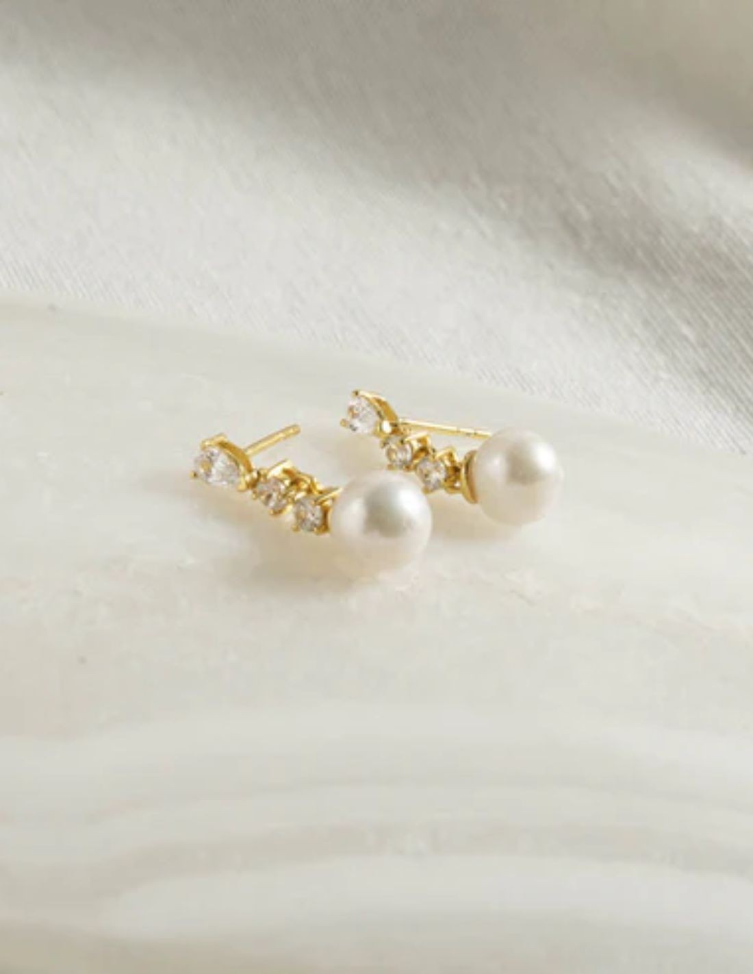 Fine earrings with zirconia and pearl end, a minimalist and elegant design in gold plated brass.