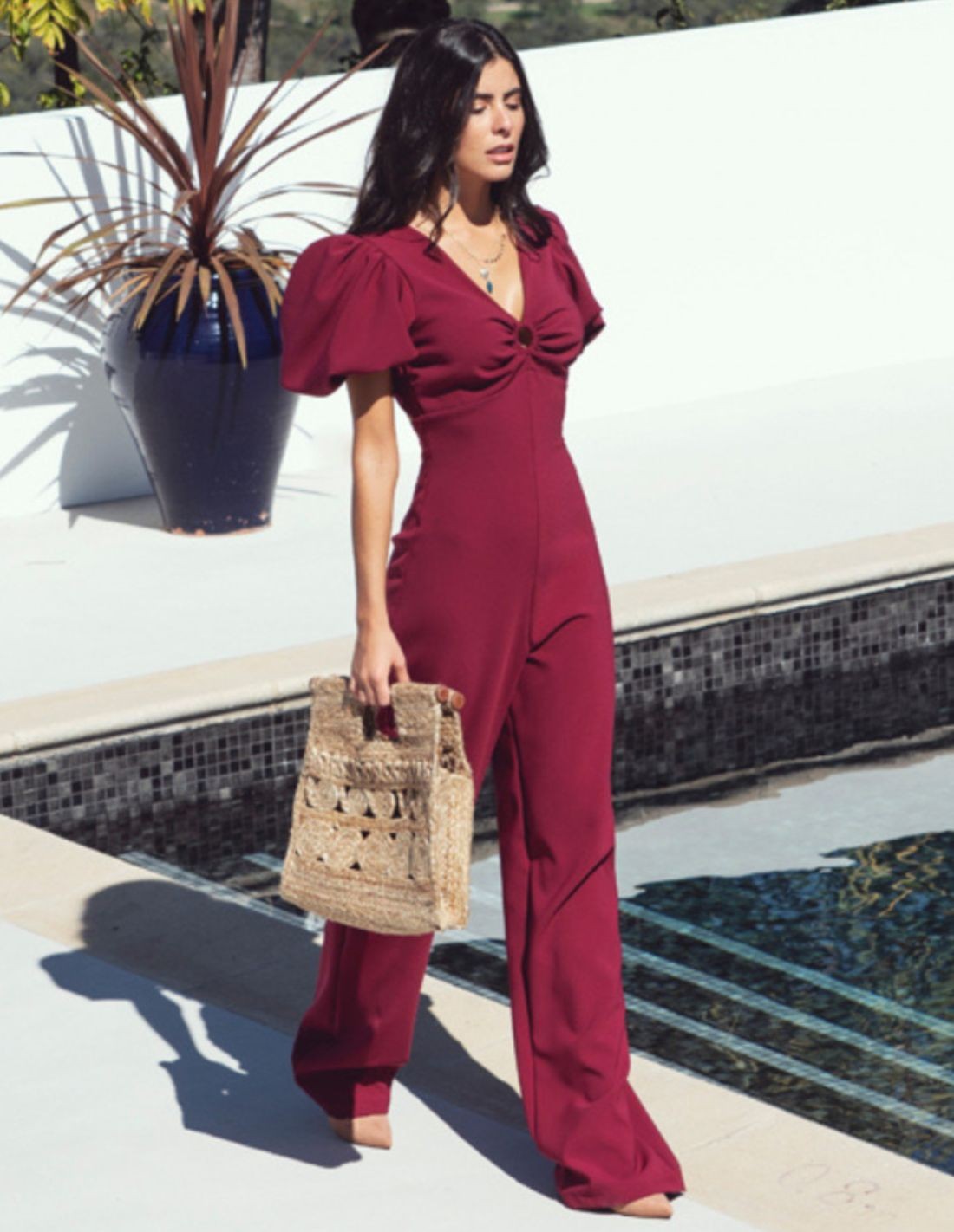 This spectacular burgundy jumpsuitis the perfect choice for those looking for an elegant and sophisticated look. Designed with short puffed sleeves, it brings a distinctive and modern touch that highlights femininity. Its open back with a knot or bow closure allows it to fit perfectly, creating a slim and flattering silhouette.