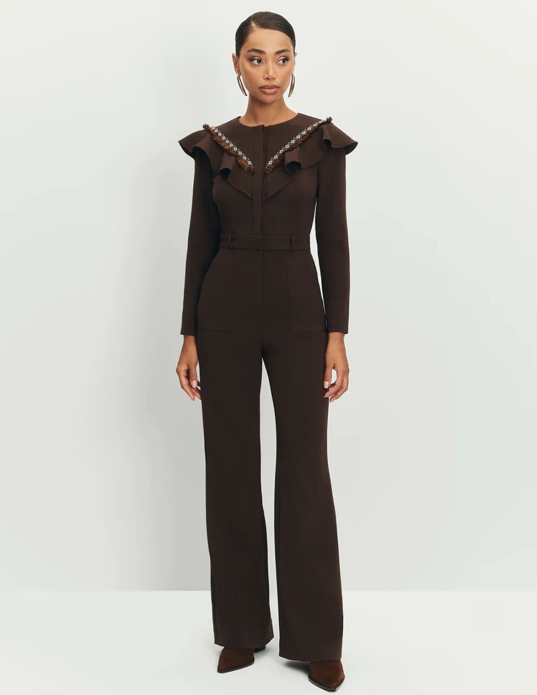 If you want to escape from dresses, and prefer to innovate in your special occasions, this brown fitted jumpsuit will be your ally! Made with a maxi collar closed with ruffles and adorned with trimmings, bangs and beads. It incorporates long sleeves and the trouser part with straight leg that allows its comfort and stylizes the figure. A garment that you can elevate with accessories for a special event or that you can also wear in a more casual way, it will be your favorite!