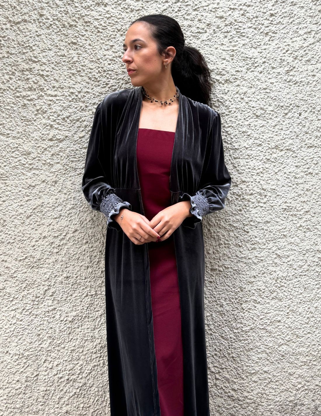 This velvet guest kimono is a versatile garment designed to enhance any look. Designed with empire cut and straight fall, which provides a very flattering and elegant silhouette. The sleeves are finished with elastic at the wrist. A comfortable and sophisticated piece that you can wear both in formal events and in more casual looks. Its gray velvet fabric, makes it a must for your fall and winter events, either to combine with a midi dress, a set, suit or even a more risky styling.