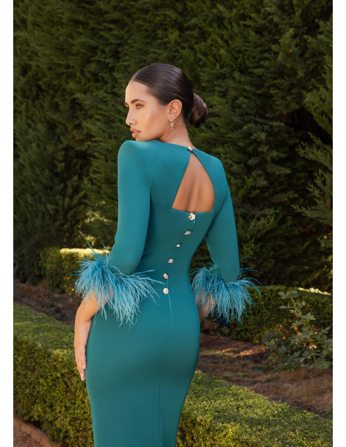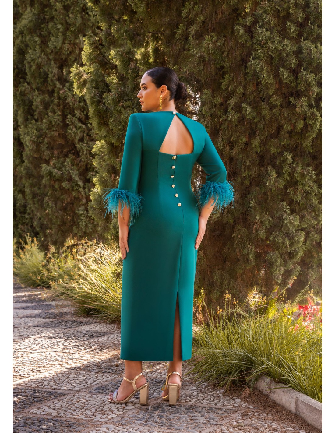 Midi dresses Green midi dress with puffed sleeves €259.00 This green midi dress will be a sure hit for your next event. A midi cut dress in bottle green with short puffed sleeves, round neckline, semi-covered back that fits with a bow, fully lined and with invisible zipper at the bottom. Add to cart