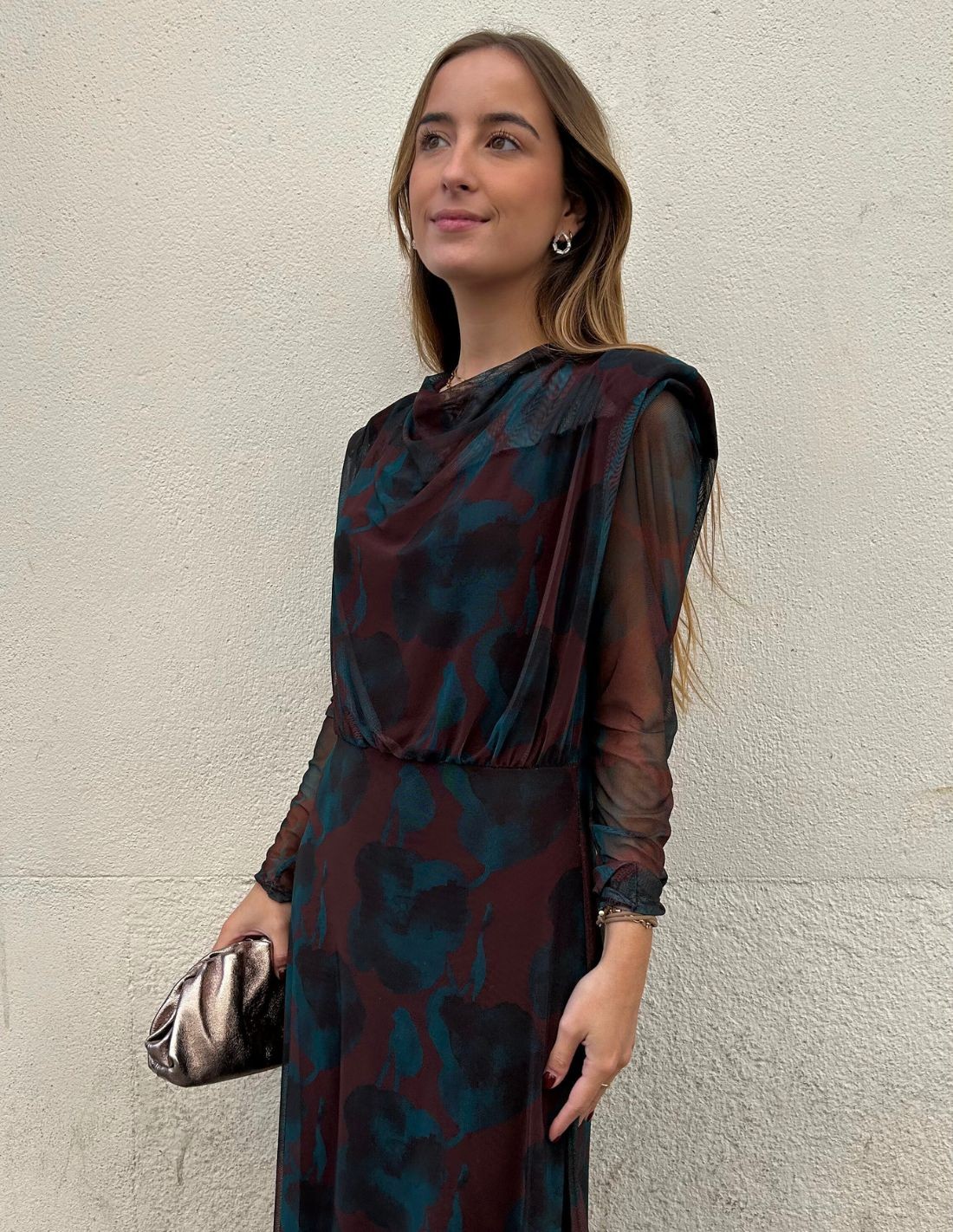 If you have an event in autumn and you still do not have your guest look, this midi dress may be the ideal choice. A dress with midi cut design, made of printed tulle fabric in blue and brown tones, with incorporated shoulder pads and long sleeves in transparent fabric, with a small gathering at the waist. Combine it with bronze and brown accessories, perfect for an autumn wedding.