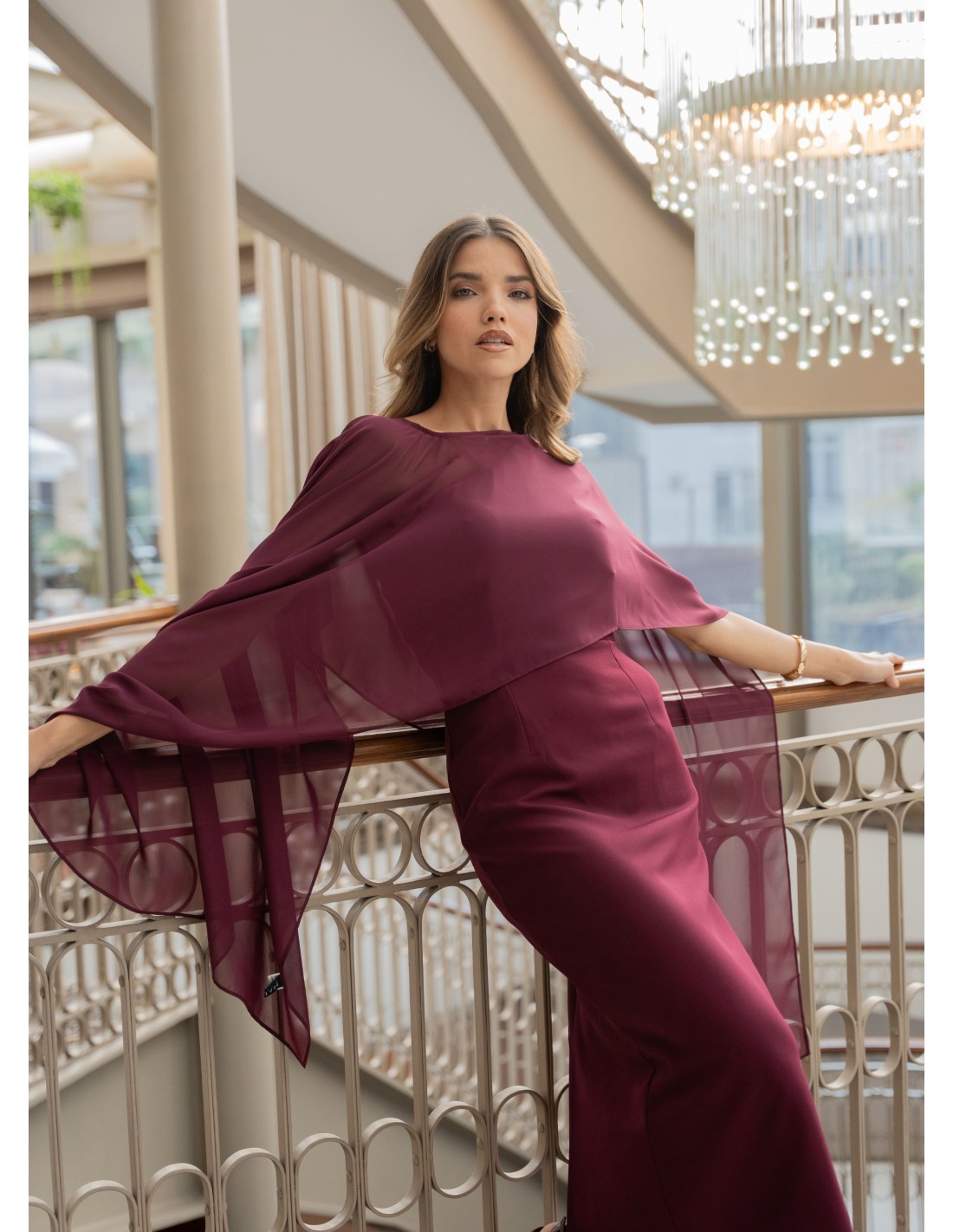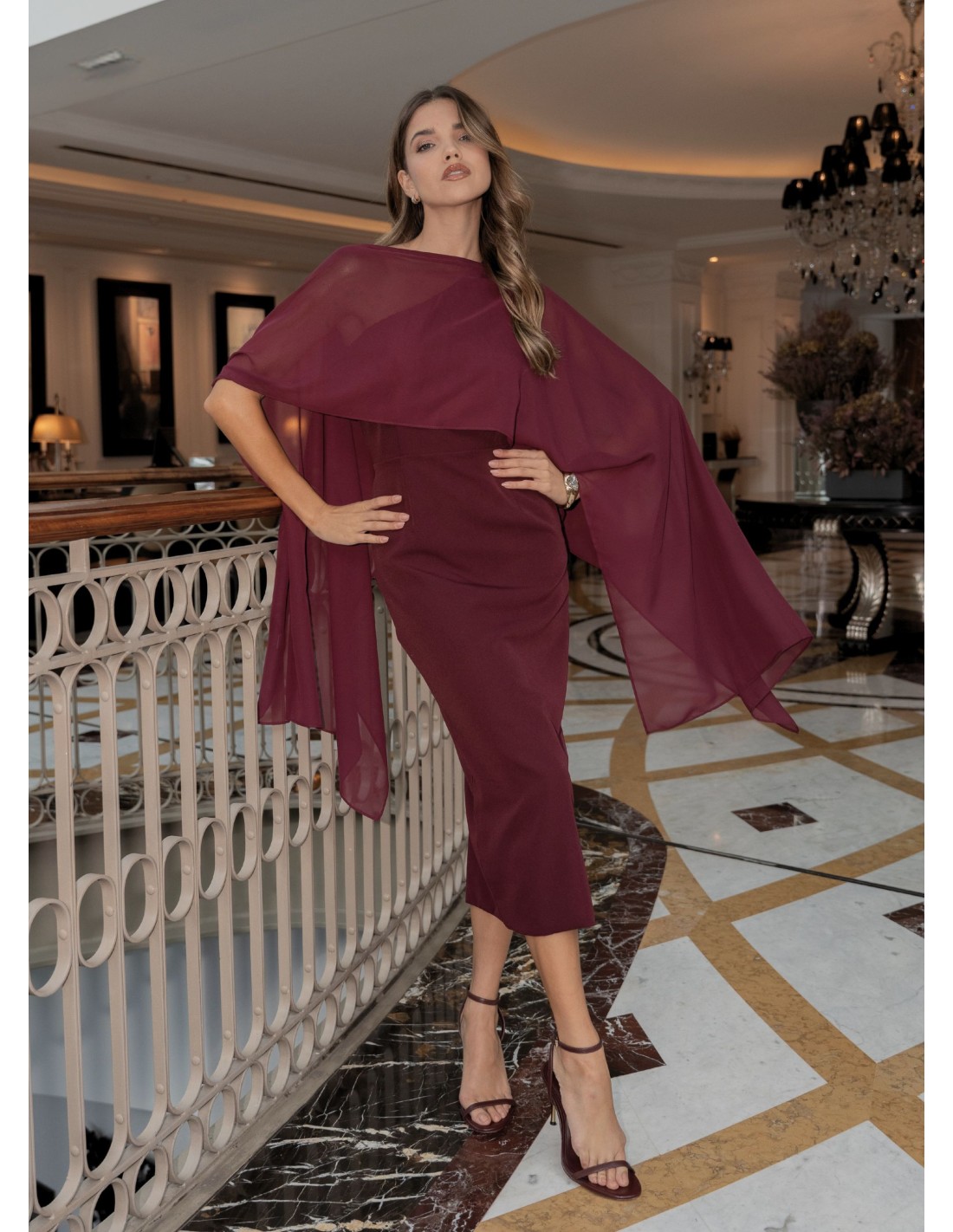 Midi dress with asymmetrical burgundy neckline and chiffon cape