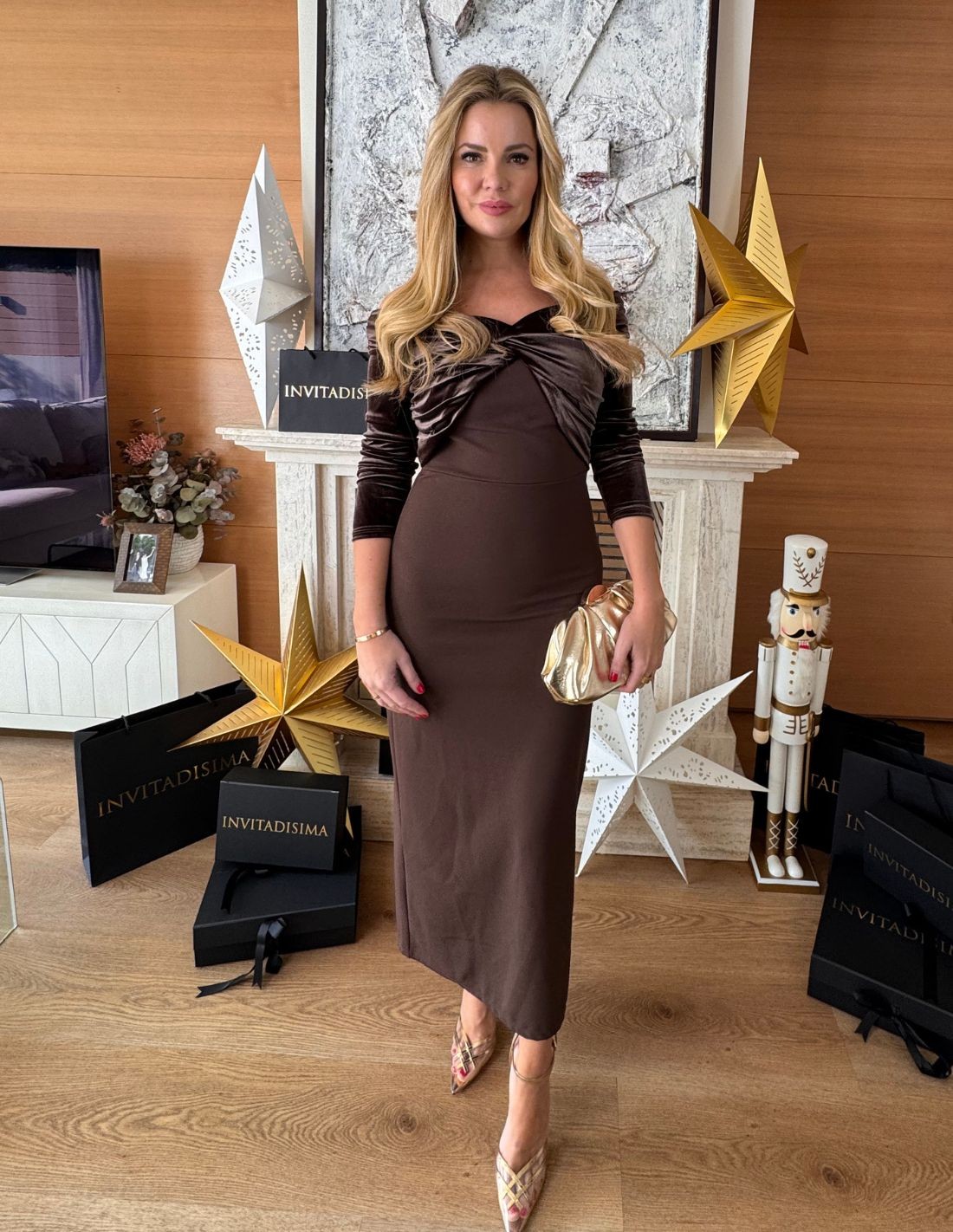 If you are looking for the perfect and elegant design for your fall event, this midi dress, will be a top 10 choice! It is ideal for this wedding season or Christmas parties. Made in two fabrics in brown tones, the chest part with velvet bardot neckline and French sleeve. The body part fits perfectly to the body. A special design that will not leave indifferent and with which you will shine.