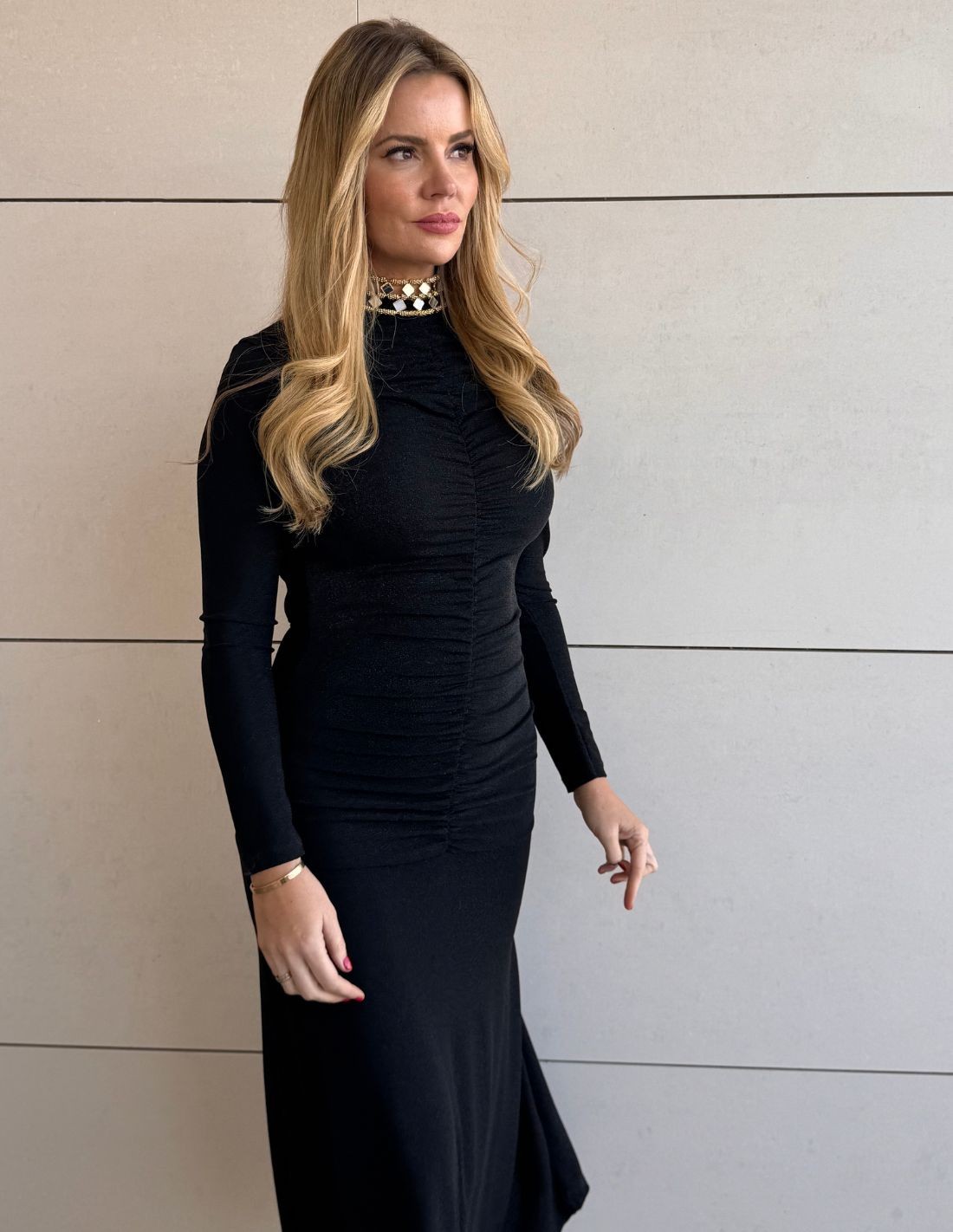 These Christmas parties deserve a design this special. This midi dress is elegant and sophisticated for your events this December, you will be the best dressed! Designed with a closed neckline and gathered in the front, making it super comfortable and flattering. Made in black lurex shiny fabric that fits perfectly to the body. You can combine it with metallic accessories to shine on Christmas Eve, business dinners or family parties.