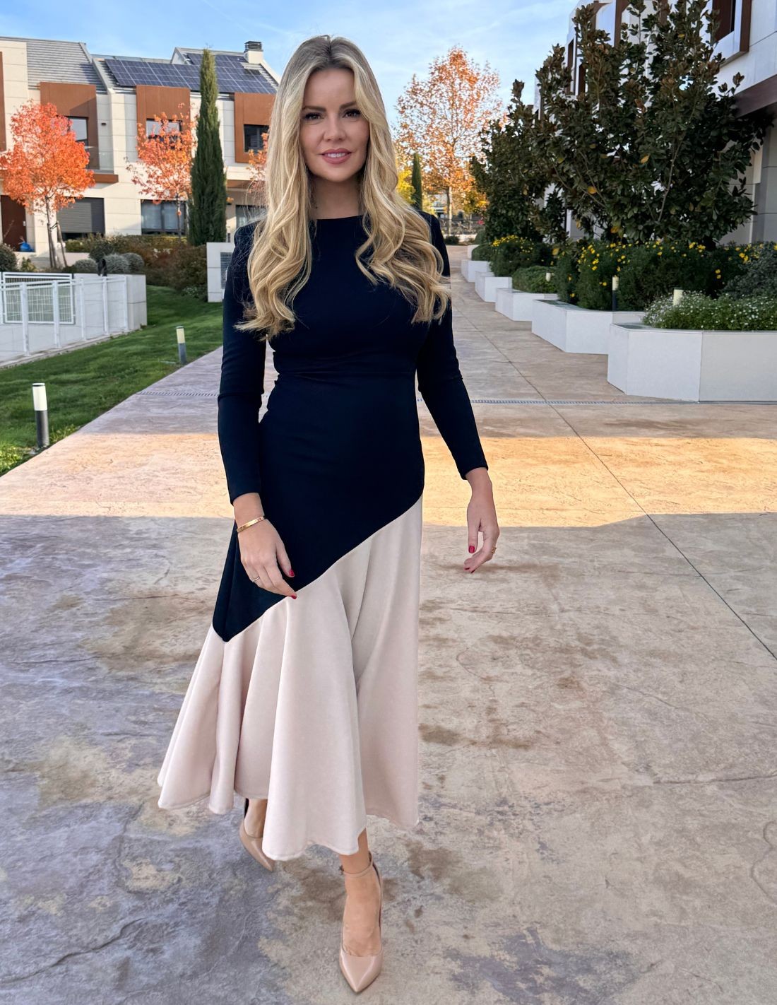 do you have an important event this October/November? This midi dress will make you the most special guest! A very special design with navy blue body, long sleeves and shoulder pad. The contrasting beige skirt gives it that elegant and sophisticated touch, besides making it a unique dress. Perfect for winter weddings, which you can complement with a stole, or for Christmas events with a velvet kimono, you will fall in love!