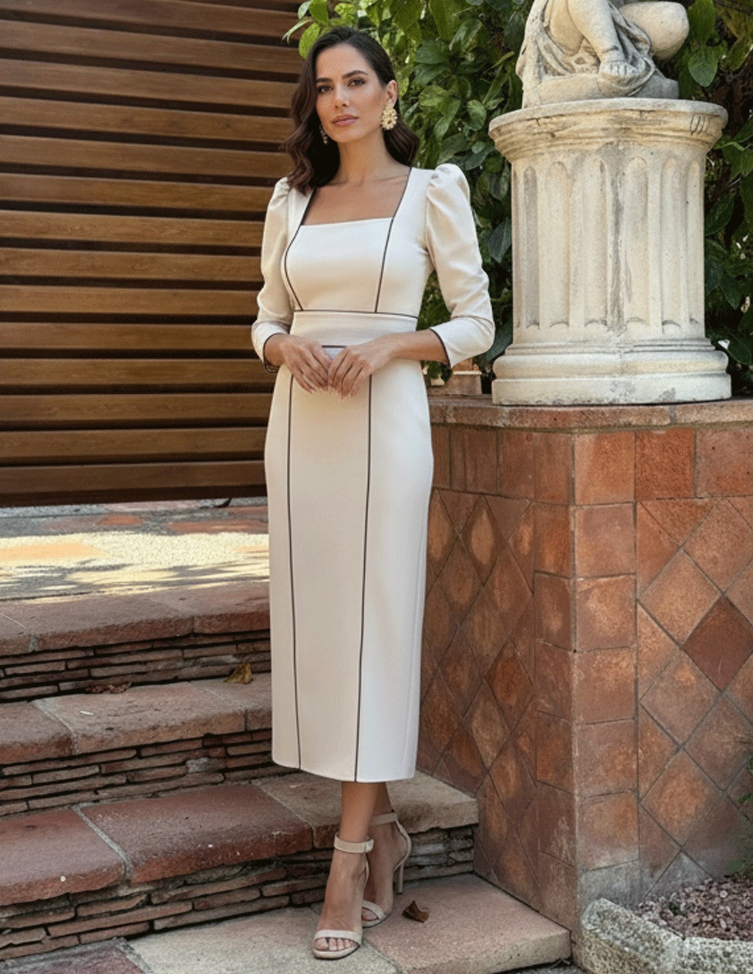 Its midi cut slims the silhouette and makes it a perfect choice for morning weddings, baptisms, communions or celebrations where an elegant, discreet and timeless look is sought. The design combines comfort and style, making it ideal for guests who value neutral tones and differentiating details.