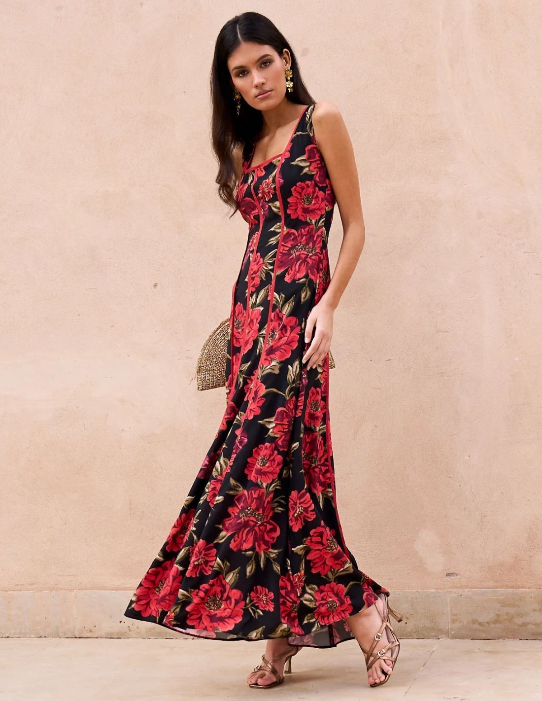 This midi guest dress made on a black base, stands out for its floral print design in red and maroon tones that runs throughout the garment, providing a sophisticated aesthetic with a classic air. The top is defined by a square neckline, framed by wide straps that provide a firm structure. The most distinctive technical element of this model is the contrasting red vertical piping.