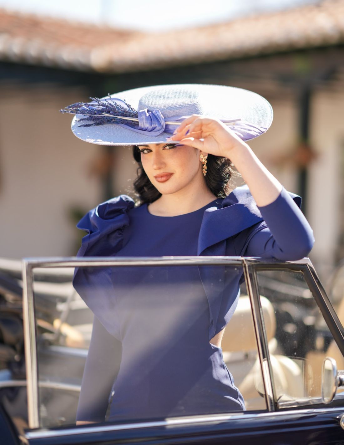Vestido midi en azul marino con detalles de volantes en los hombros