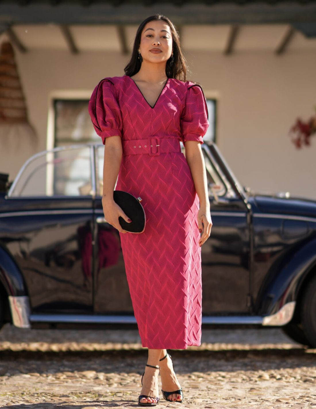 Elevate your style with this sophisticated fuchsia midi dress, designed to stand out with elegance and personality. The subtle print adds texture and depth to the color, while the puffed maxi sleeves add a romantic, contemporary touch that perfectly balances the silhouette.