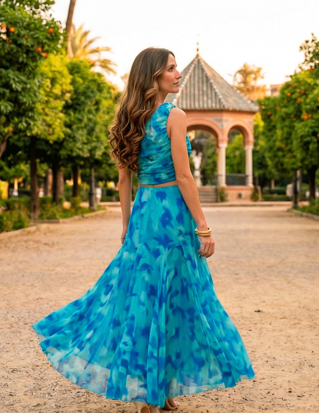 Printed chiffon ensemble in blue tones consisting of an asymmetrical one-strap top and midi skirt with flounce. A light, elegant look, perfect for guests at daytime weddings or summer events.