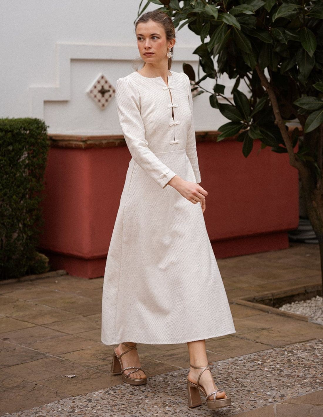 The dress incorporates oriental-inspired fastenings on both the chest and sleeve cuffs, a distinctive detail that adds originality and a refined touch to the design. The combination of these elements gives rise to a unique garment, perfect for special events or for those looking for an elegant and different look.