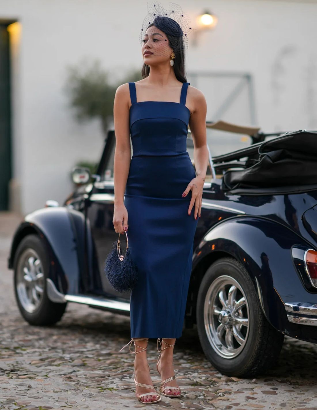 This midi dress will save you any event this season. Made in taffeta, a comfortable fabric that fits perfectly, with straps and a straight cut. It also includes a chiffon cape with sleeves and shoulder pads that give that elegant touch to the design. Perfect for spring events such as weddings or special parties. Its navy color makes it an elegant and sophisticated design.