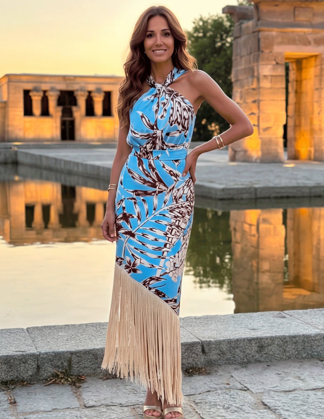 Its printed fabric brings personality and freshness, while the bangs on the hem add a spectacular movement when walking, making it a unique and very flattering piece. The halter neckline slims the top and enhances the shoulders, creating an elegant and feminine silhouette.