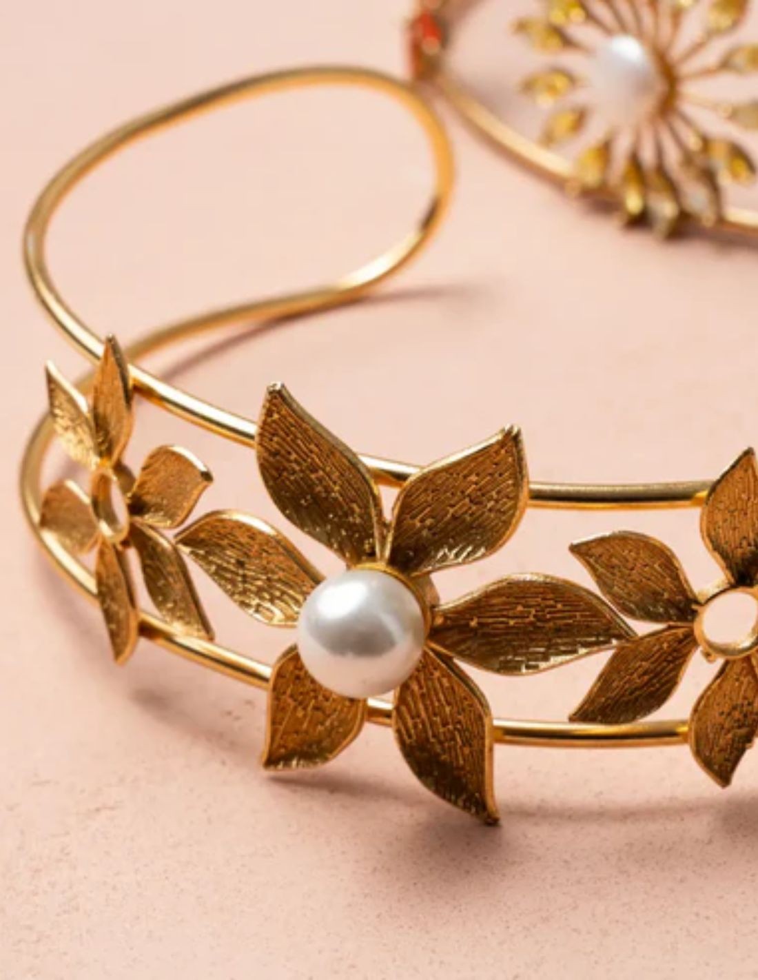 This choker with a rigid structure and a very elegant and original design, with a floral design with textured petals in matte finish, opens delicately around a central pearl that brings light to the face. An ideal accessory to give that sophisticated and special touch to any look, whether it is a casual look to give it a different touch or a guest look to elevate it to the maximum.