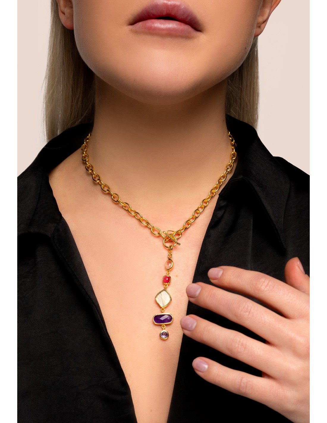 Gold chain necklace and colored stones for guest or casual looks