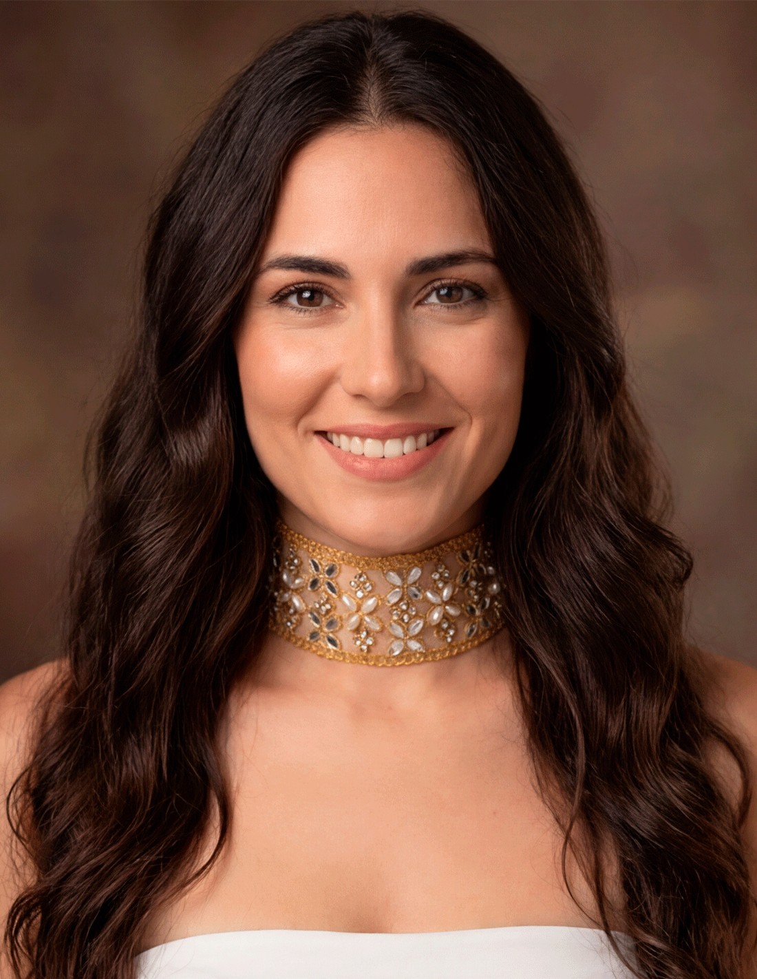 Golden choker embroidered with crystals and pearls in floral design. A sophisticated handcrafted piece that elevates any guest's look.