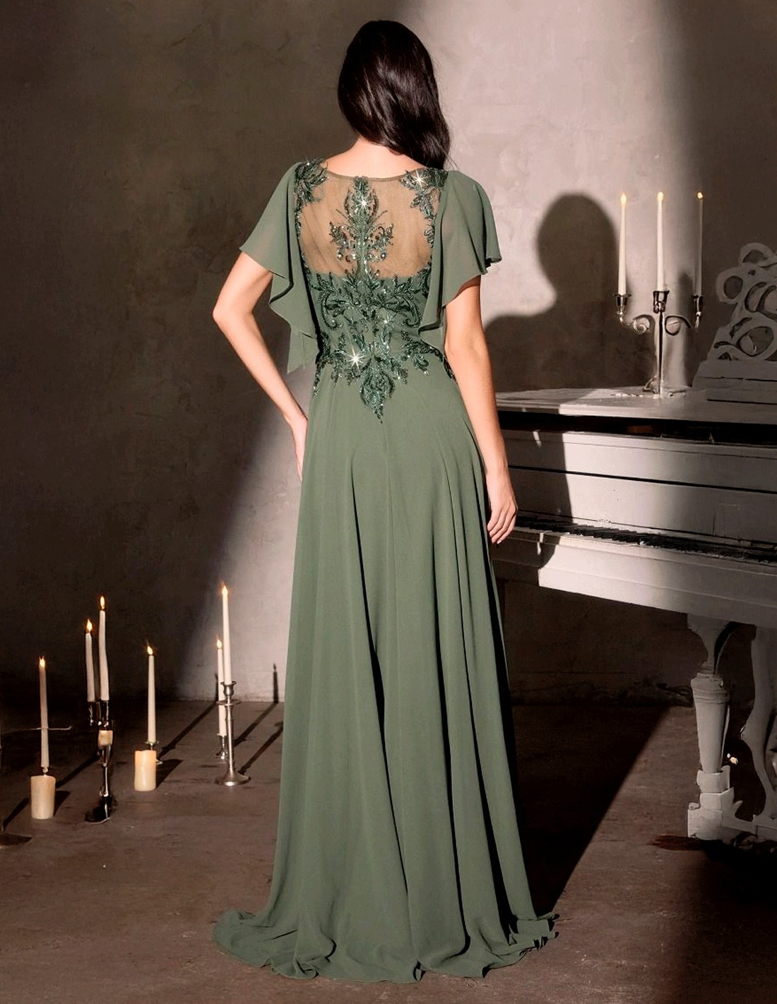The body and closed back are made of a delicate embroidery of rhinestones with subtle semitransparencies, which provide light and texture without losing elegance. The cascading sleeve adds movement and a wraparound effect that stylizes the figure and gives a very special air to the outfit.