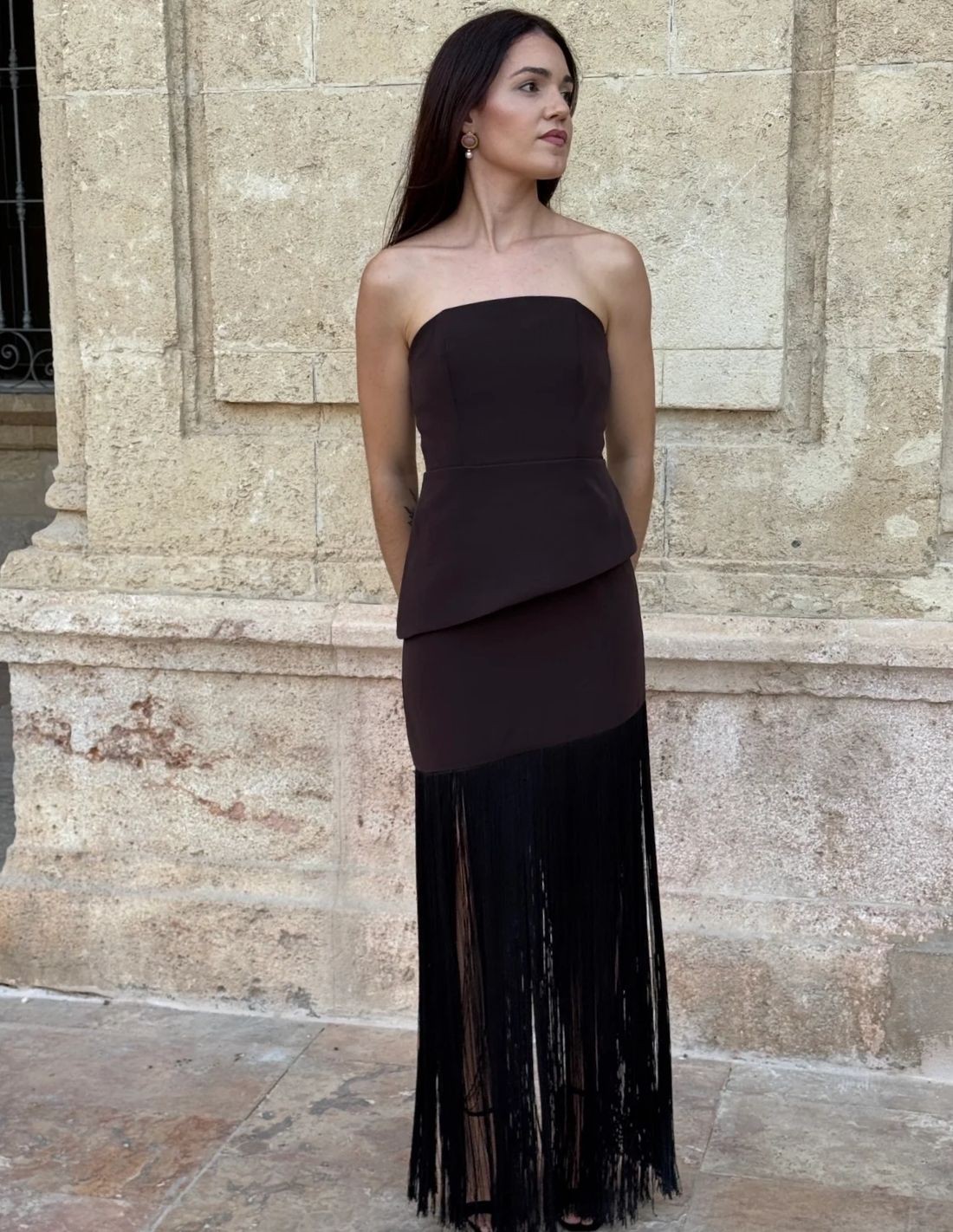Guest ensemble with strapless top and asymmetrical fringed skirt