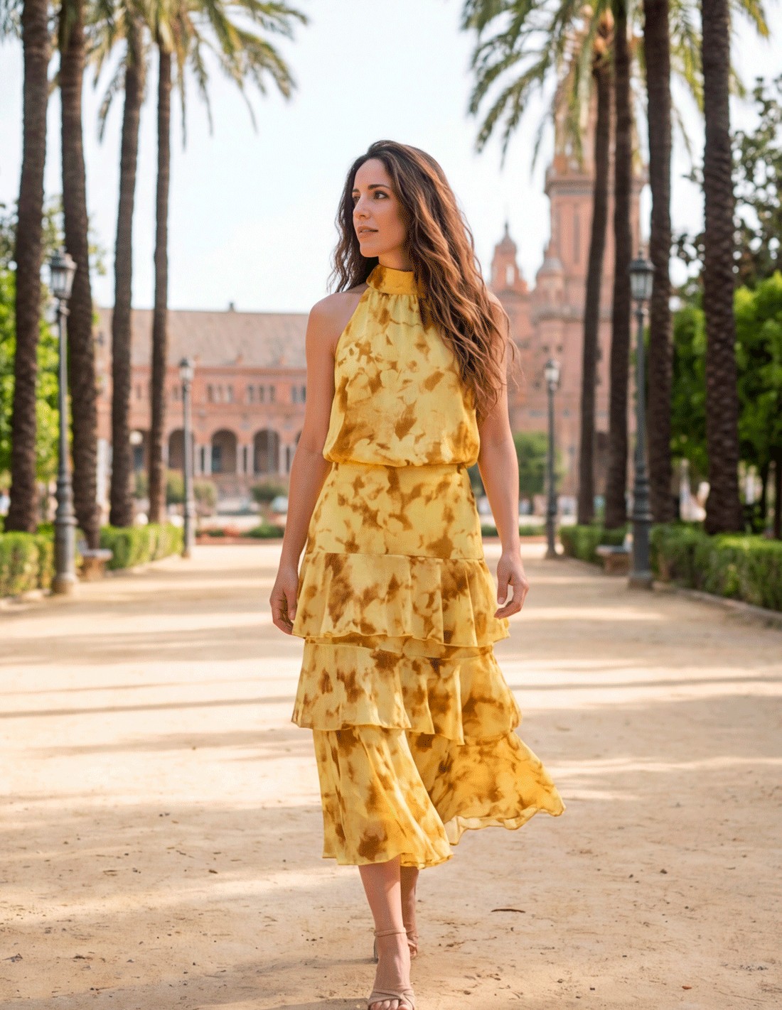 The halter neckline top slims the upper body and adds elegance, while the midi skirt with layers and movement creates a light and very feminine silhouette.