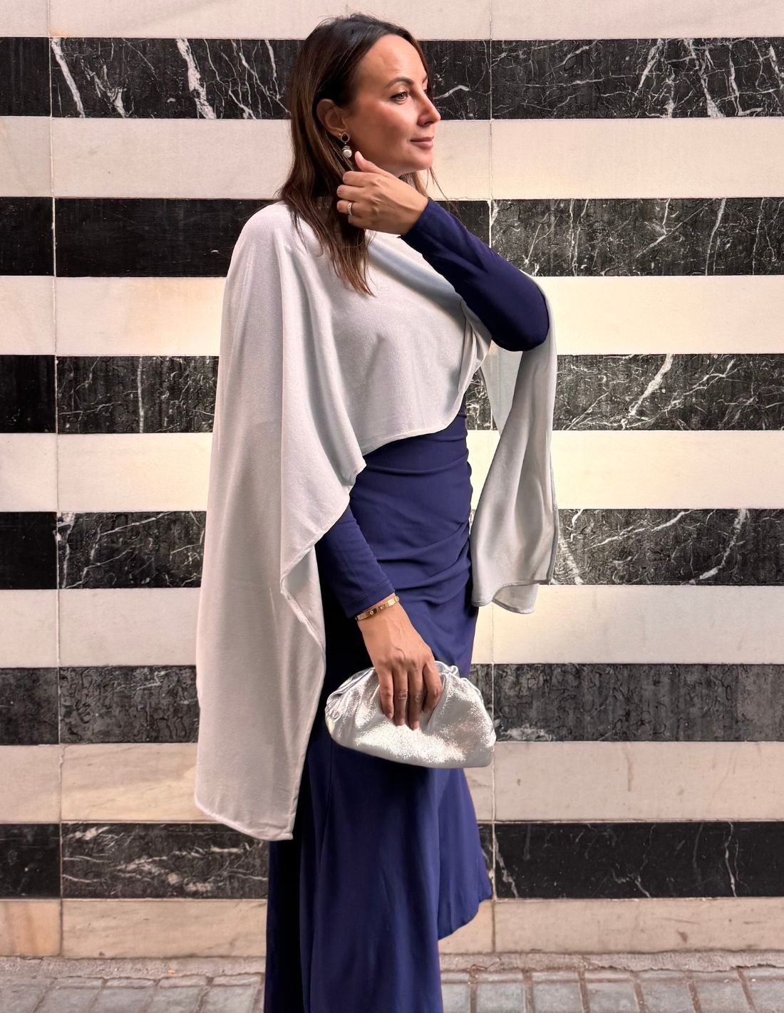 If you are looking for that special accessory that will elevate your look and that you will not want to take off, this thin silver cape will be your ally. You can combine it with hundreds of looks, because of its color and fabric, it is super elegant and easy to combine. You can wear it for an event as well as for a more casual look. And you can also wear it as you like. Its shiny fabric brings a sophisticated touch that will be a yes for your party look.