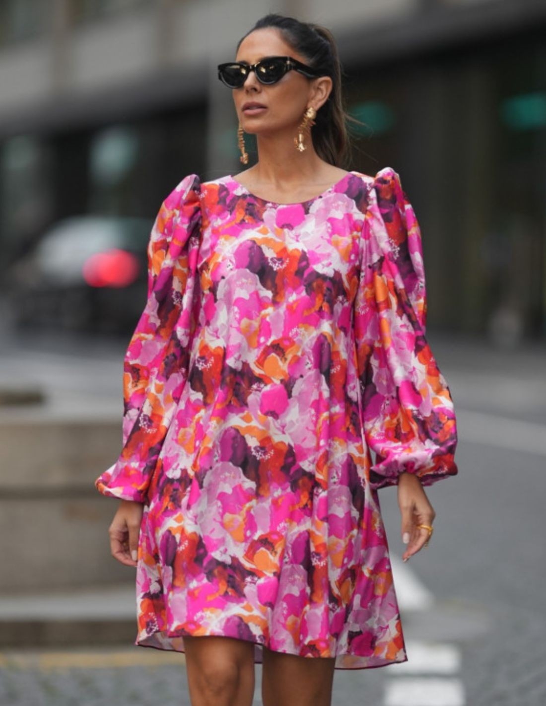 Whether for an event or for everyday wear, this short printed dress is ideal for spring or summer. A short dress with floral print fabric, long sleeves, round neckline, closed behind the neck. Fully lined, ideal for special occasions.