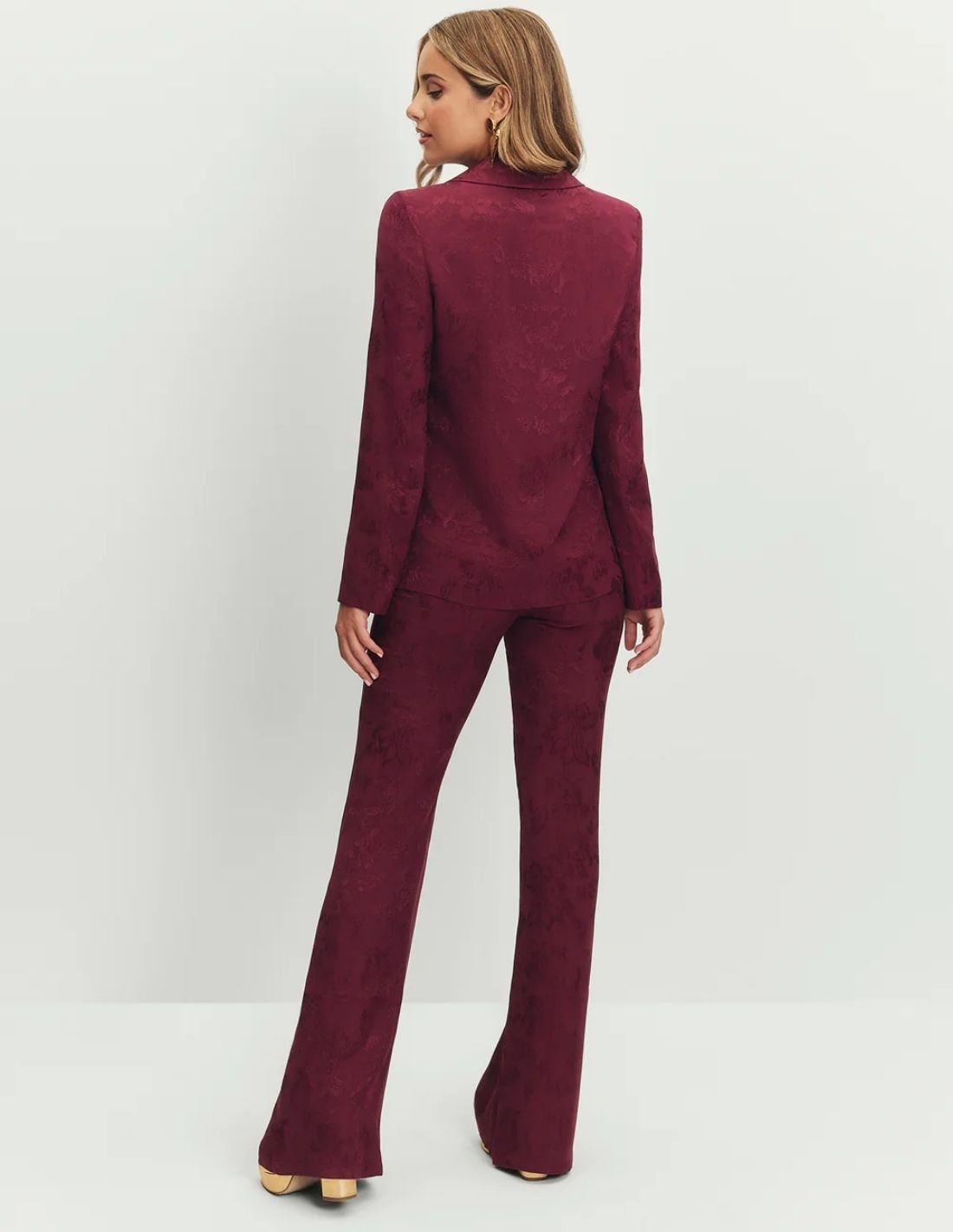 The eggplant jacquard pants are a sophisticated garment designed to stylize and lengthen the feminine silhouette. Made of 100% viscose jacquard, it stands out for its subtle texture and elegant flowing drape. Its high rise enhances the waist and the flared silhouette (flare) provides a modern and flattering movement.