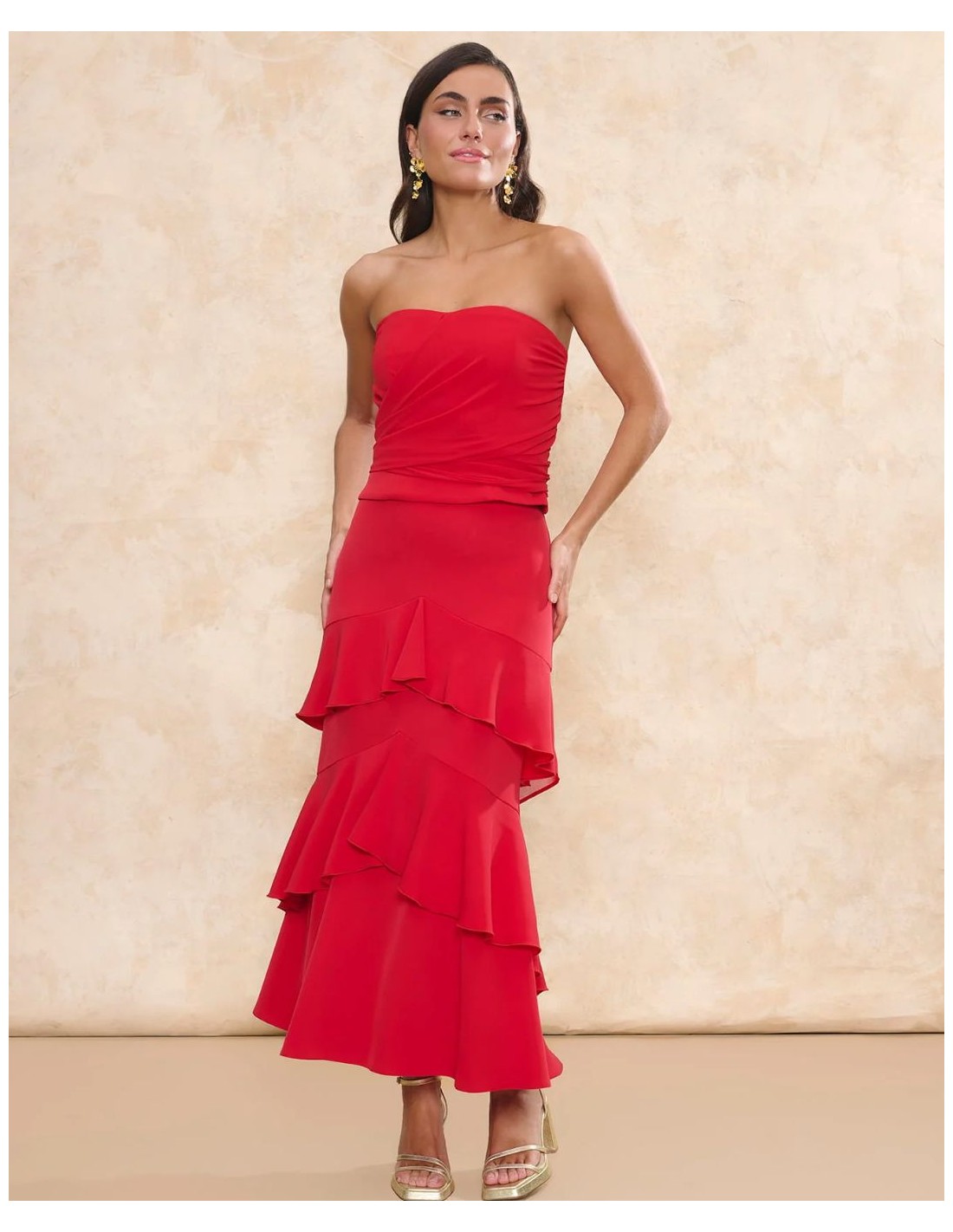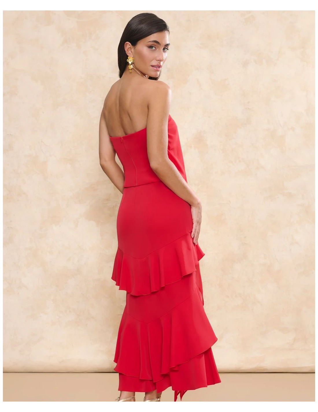 Red crepe midi guest skirt with overlapping ruffled ruffles