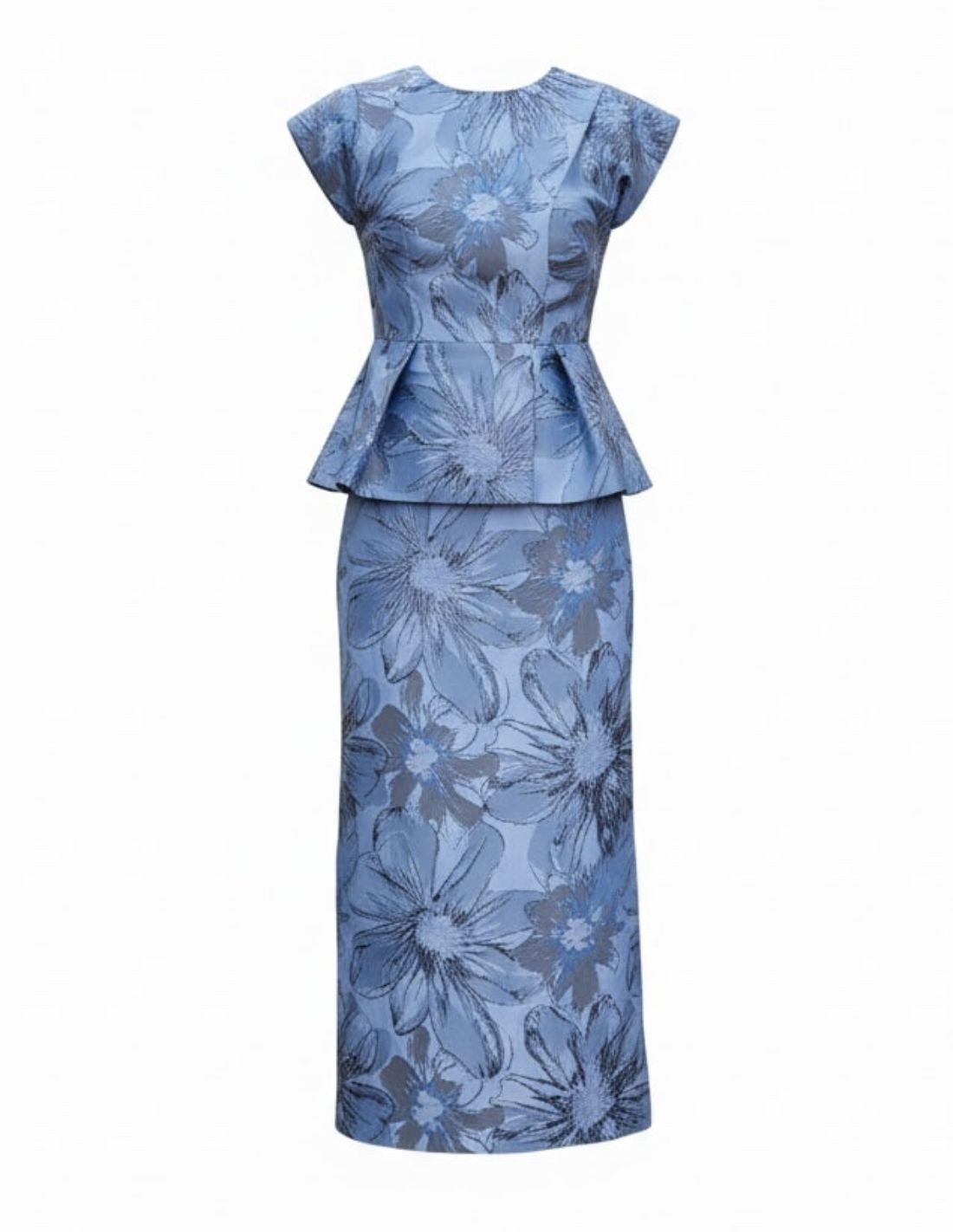This midi skirt will become an indispensable piece in your closet. Made in a blue brocade fabric with floral print. If you wear it with its matching top, you will have an ideal two-piece for events or even to wear separately in a more casual way. Its straight cut slims the figure and also includes a back opening that provides comfort and a subtle touch.