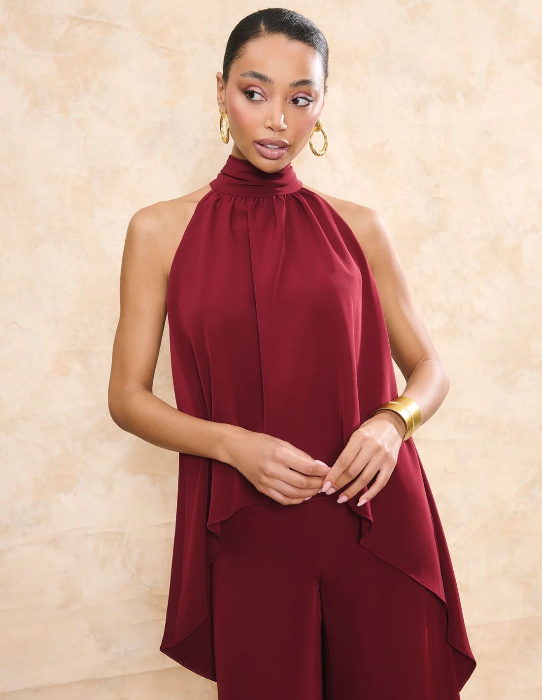 Top de invitada granate con cuello halter y caída vaporosa