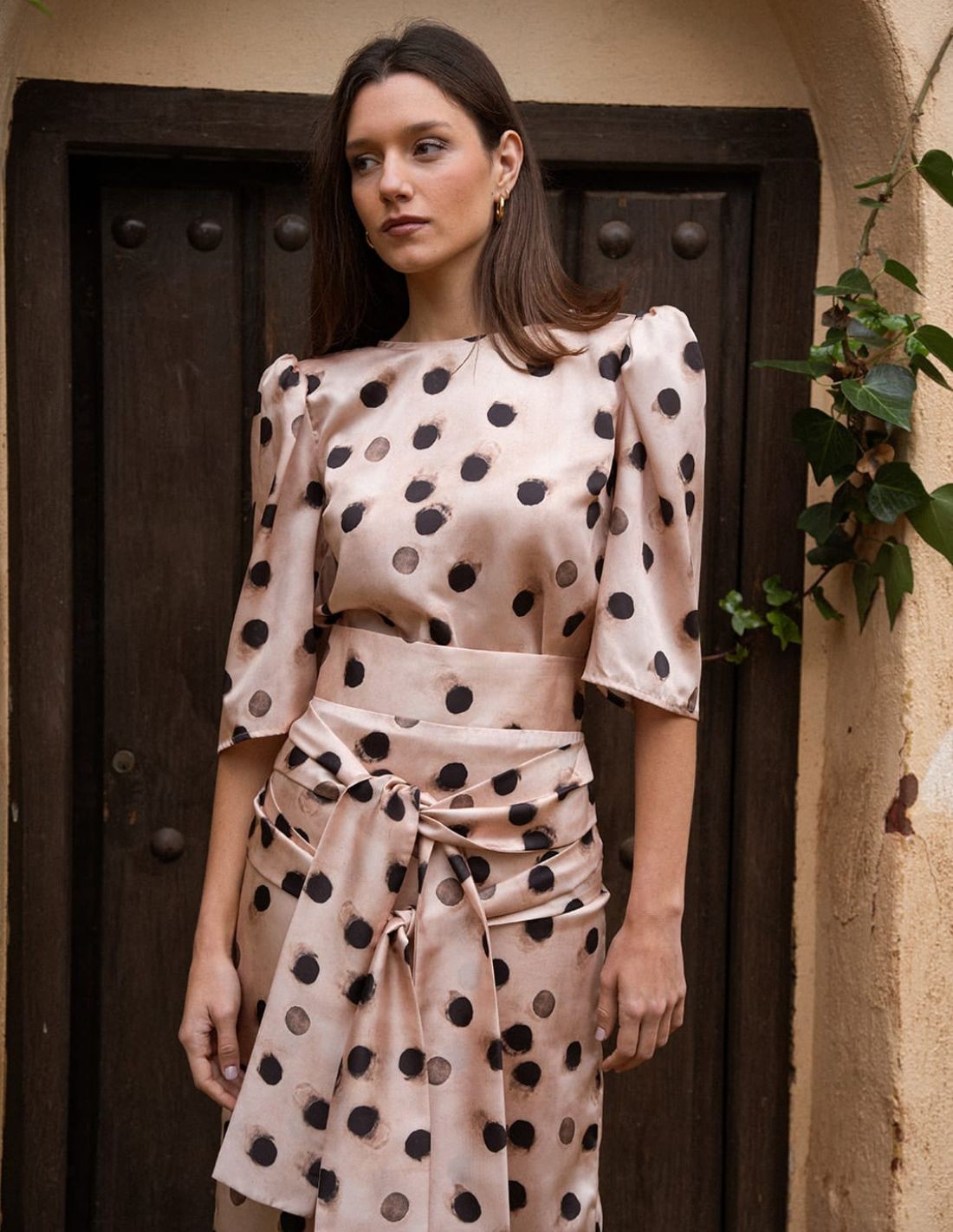 Short sleeve top with polka dot print, elegant and versatile, ideal to combine with Rania, Lucia or Begoña skirts.