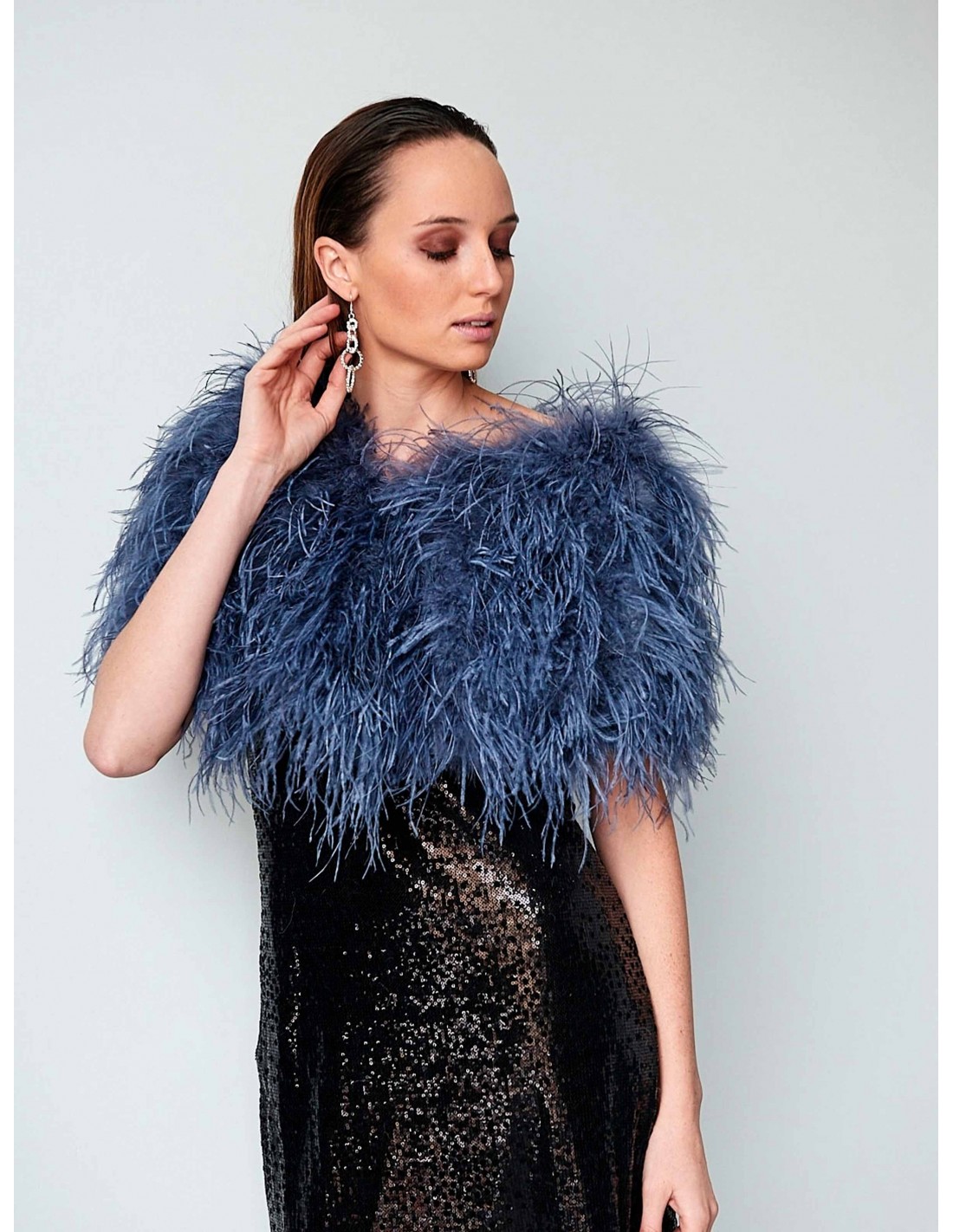 Beautiful and flattering ostrich feather wrap with inner zipper available in blue and black colors. A star accessory that will complete all your winter guest looks.